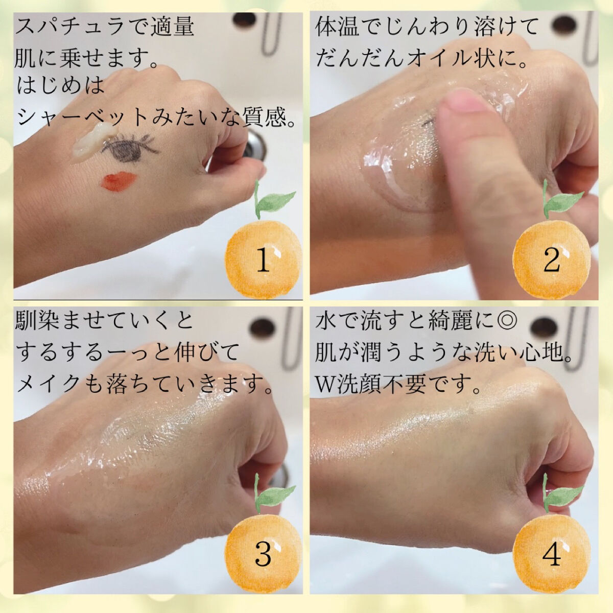 - オレンジ果皮油*5,400ppm配合され、過剰な皮脂や濃いメイクアップまで包み込んで落としながらしっとりと洗い上げるマルチなメイク落としです。 *保湿成分 【使用方法】水気のない顔に適量を取り出して、やさしくマッサージするようになじませた後、手に少量の水をつけて微細な泡ができるように軽くマッサージ。ぬるま湯で洗い流します。