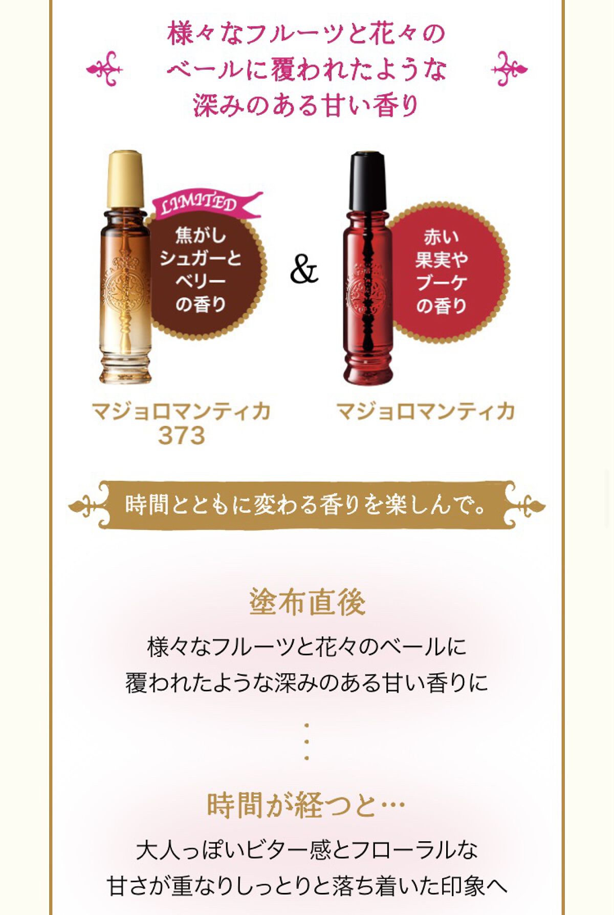 マジョリカマジョルカの大人気フレグランス! 限定のマジョロマンティカ3種をそれぞれ一滴ずつ組み合わせてみたよ! 濃厚なベリージャムがマシュマロに包まれるような甘く優しい香り。 優しい甘さと華やかな香り。どの香りもどの組み合わせもいい香り〜