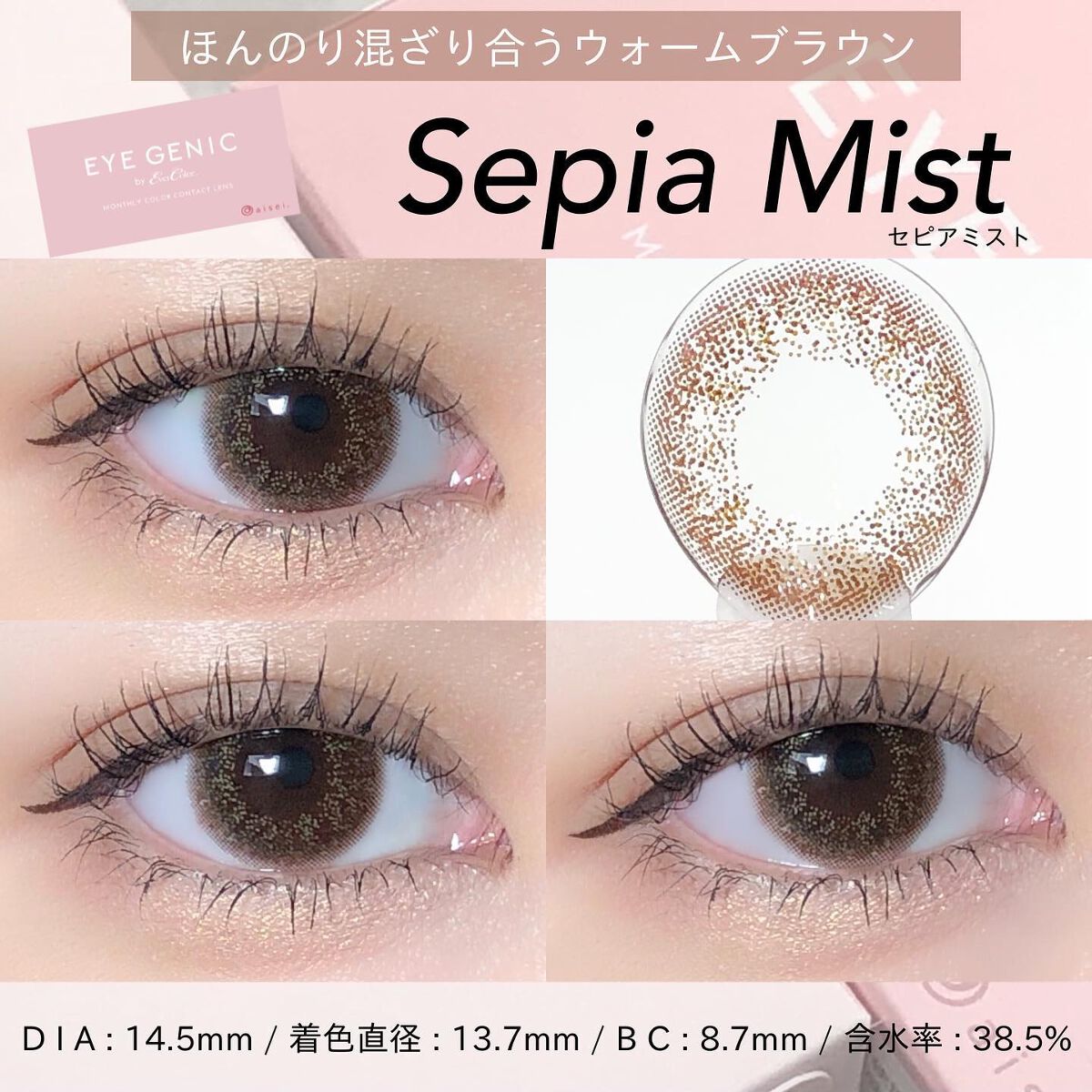 - ナチュラル、キュート、ハーフの3タイプ ナチュラルシリーズ:スリークブラウン・ダスティブラウン・シマーショコラ・スフレコーラル・ハニースキン・セピアミスト・ラスターキャメル・イノセントヘーゼル キュートシリーズ:スウィートティア・モダングランジ・シャイニーリッチ・スムースアーバン ハーフシリーズ:パールグレージュ・リュクスベージュ・シェイドオリーブ 瞳から自分らしさを彩ってほしいという想いから誕生しました。 時に裸眼のように無防備に、時にドラマティックで華やかに。 豊富なバリエーションでどんな瞬間も思い通り輝く瞳に・・。 DIA:14.5mm BC:8.7mm 中心厚:0.07mm( -3.00D ) 含水率:38.5%