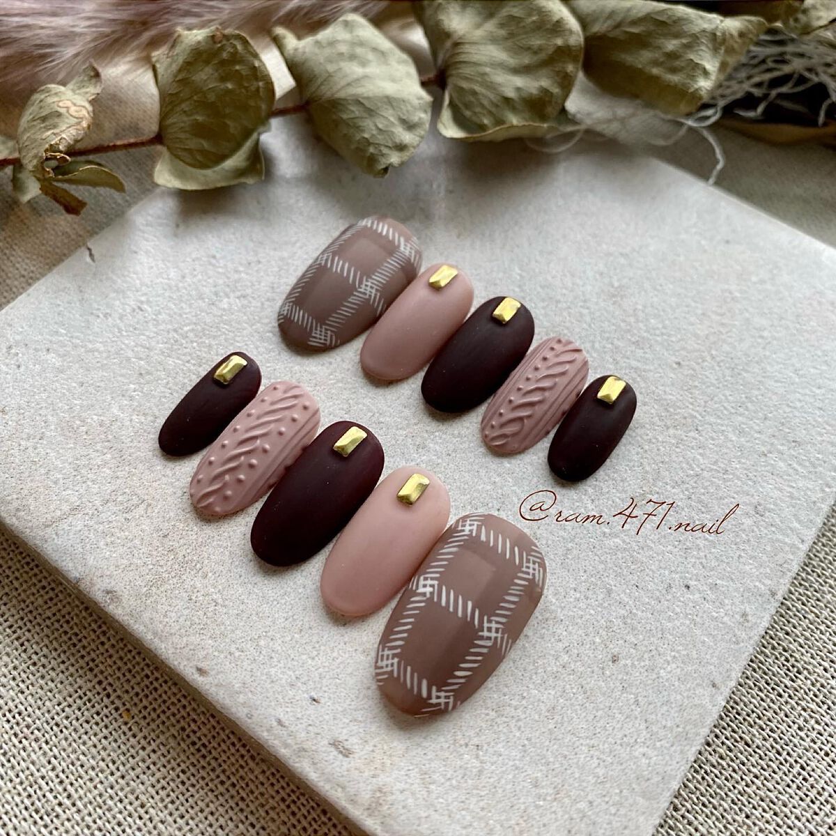秋冬にぴったり✨ほっこりチェックとニットネイル デートや普段使い・推しの衣装・ドレス・振袖・袴に合わせたお任せオーダーも承っております✨ くすみピンク ブラウンネイル 一生リピ宣言