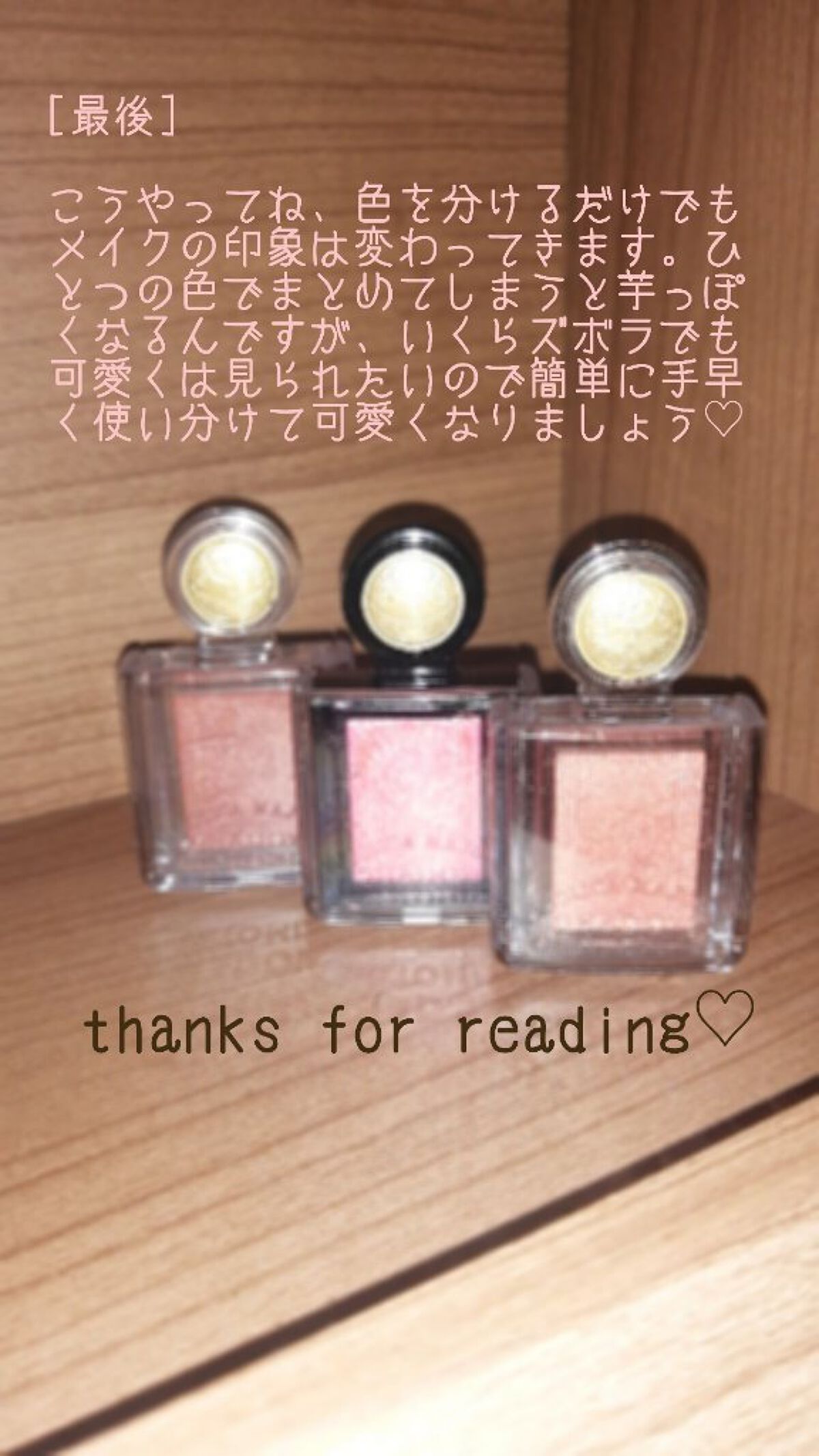 [BE330]の色味はですね、ベージュに気持ちピンクをを混ぜたような色味をしているのでピンク発色の[PK401]大粒ラメシャドウがよく映えます。そして最後に赤茶色のような深い色味の[BR583]で目尻を締めることで全体的にバランスが取れてナチ...