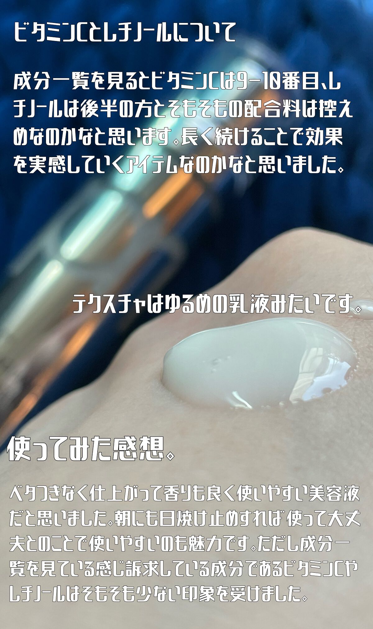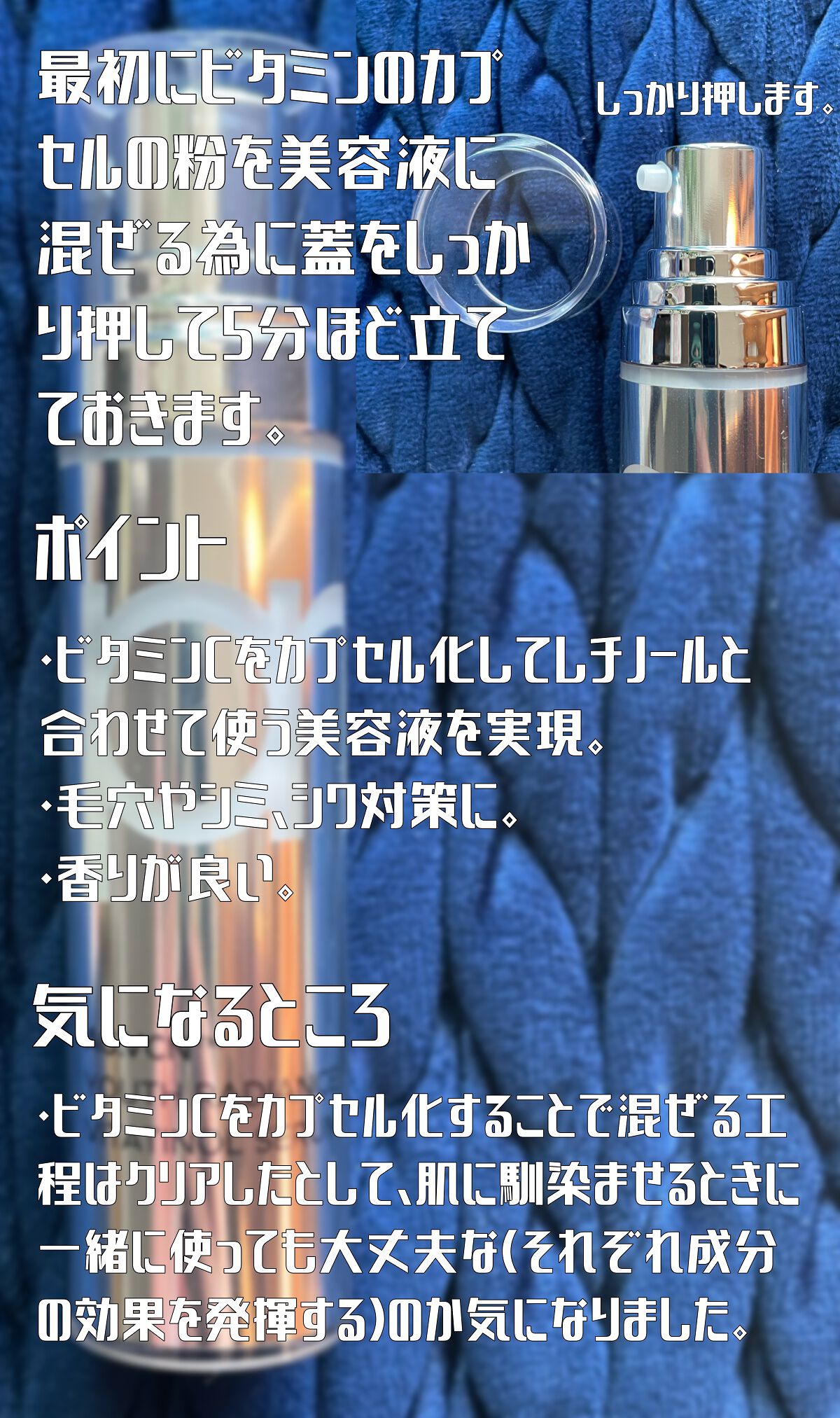 シルバーのボトルは、とってもオシャレ カプセルパートとセラムパートで分かれているのでふたを開け、カチッと音がするまでポンプを押し、最初に使用するときは、カプセルが溶けてセラムとよく混ざるように30秒以上、上下に振り、5分ほど立てておき、お肌になじませます。 ビタミンC+レチノールを実現したセラムはビタミンCカプセルとピュアレチノールの革新的な組み合わせで、毛穴や弾力などの肌の状態をケアし、健康的で美しい肌へと導くことができます。 やっぱり、別々に使ってたビタミンCとレチノールが一緒に使えるのはうれしい!