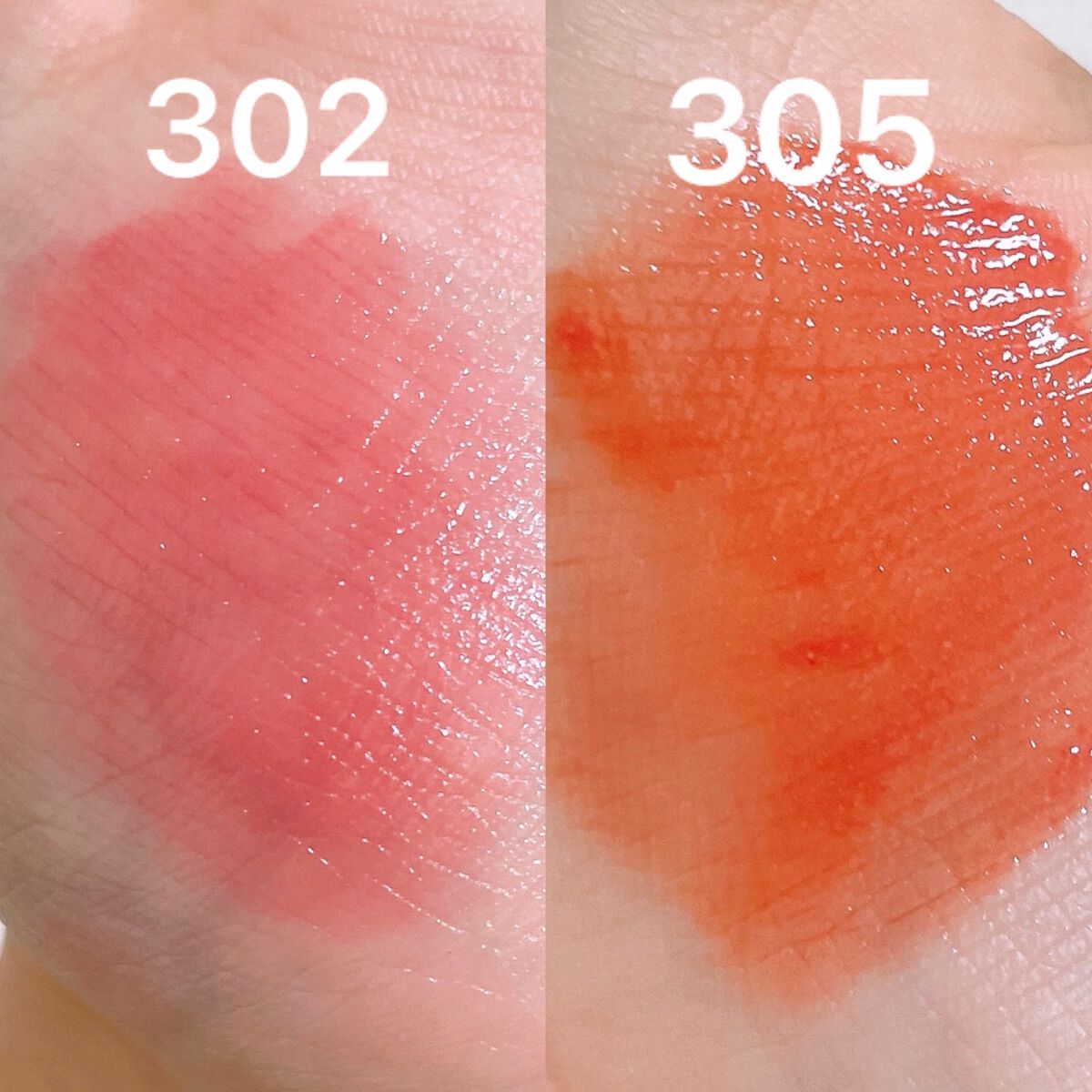 正直、302と303の違いはあまりない気がします、、 公式にはナチュラルトーンのヌードカラーと記載ありました。 有名なフルーティーグラムティントと似ていて、ほんのり甘い香りがしました。 潤いがあって色持ちもばっちりなので この冬重宝しそうです〜!
