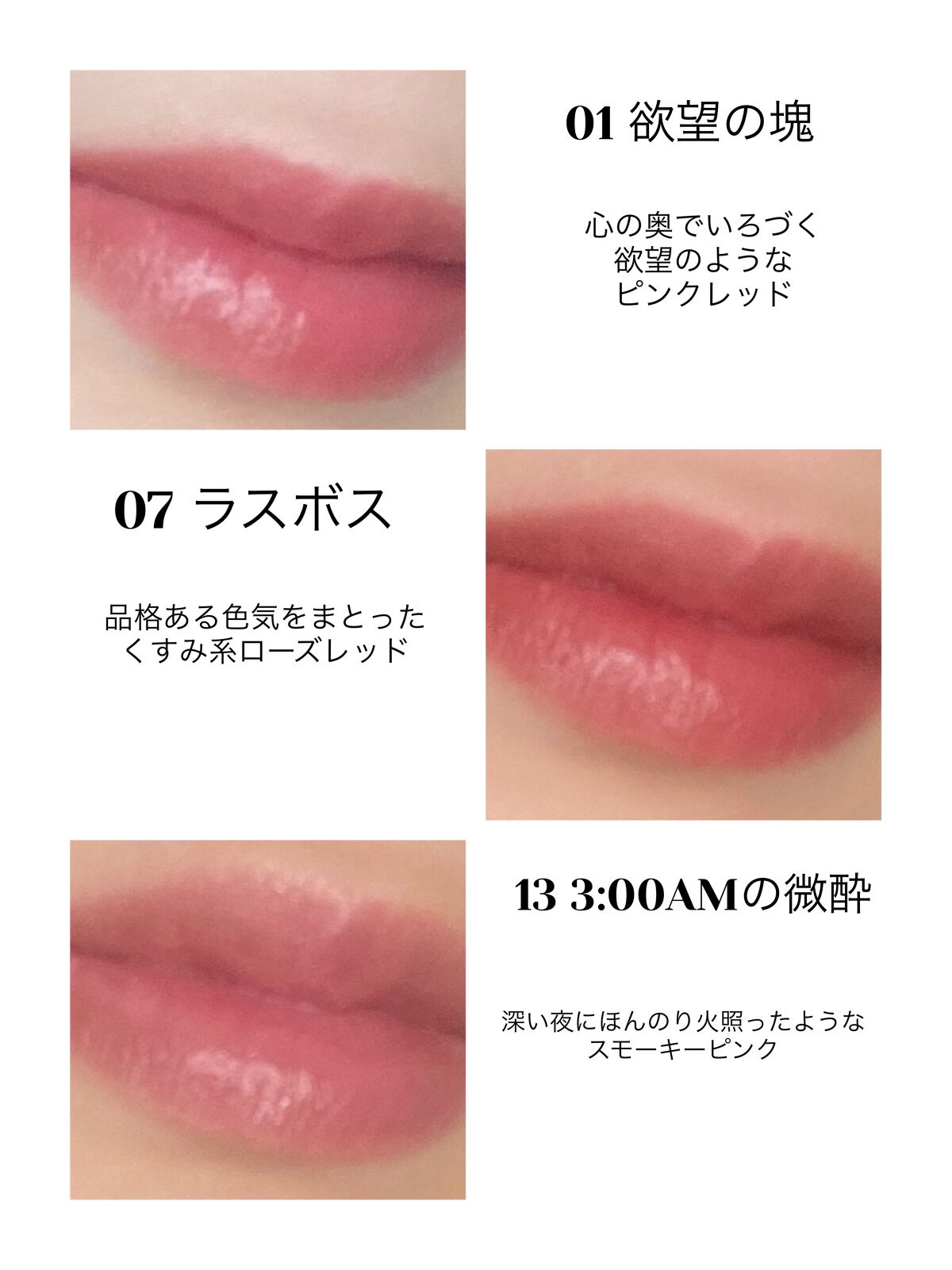 - <01 欲望の塊> テトライソステアリン酸ジペンタエリスリチル、トリ(カプリル酸/カプリン酸)グリセリル、オクチルドデカノール、ラウロイルグルタミン酸ジ(フィトステリル/オクチルドデシル)、ビスアルキル(C16-18)グリセリルウンデシルジメチコン、イソノナン酸イソトリデシル、水添ポリイソブテン、ラウロイルグルタミン酸ジ(オクチルドデシル/フィトステリル/ベヘニル)、パラフィン、合成ワックス、ダイマージリノール酸(フィトステリル/イソステアリル/セチル/ステアリル/ベヘニル)、マイクロクリスタリンワックス、水添マイクロクリスタリンワックス、ヒドロキシステアリン酸エチルヘキシル、トコフェロール、ホホバ種子油、オリーブ果実油、アーモンド油、(エチレン/プロピレン)コポリマー、ポリエチレン、ジメチコン、(+/-)(チタン/酸化チタン)焼結物、マイカ、ラウロイルアスパラギン酸Na、ラウロイルリシン、塩化亜鉛、酸化チタン、酸化鉄、水酸化Al、硫酸Ba、トリイソステアリン酸イソプロピルチタン、酸化スズ、ホウケイ酸(Ca/Al)、合成フルオロフロゴパイト、黄4、黄5、赤104(1)、赤201、赤202 <02 ピンクバナナ> テトライソステアリン酸ジペンタエリスリチル、トリ(カプリル酸/カプリン酸)グリセリル、オクチルドデカノール、ラウロイルグルタミン酸ジ(フィトステリル/オクチルドデシル)、ビスアルキル(C16-18)グリセリルウンデシルジメチコン、イソノナン酸イソトリデシル、水添ポリイソブテン、ラウロイルグルタミン酸ジ(オクチルドデシル/フィトステリル/ベヘニル)、パラフィン、合成ワックス、ダイマージリノール酸(フィトステリル/イソステアリル/セチル/ステアリル/ベヘニル)、マイクロクリスタリンワックス、水添マイクロクリスタリンワックス、ヒドロキシステアリン酸エチルヘキシル、トコフェロール、ホホバ種子油、オリーブ果実油、アーモンド油、(エチレン/プロピレン)コポリマー、ポリエチレン、ジメチコン、(+/-)(チタン/酸化チタン)焼結物、マイカ、ラウロイルアスパラギン酸Na、ラウロイルリシン、塩化亜鉛、酸化チタン、酸化鉄、水酸化Al、硫酸Ba、トリイソステアリン酸イソプロピルチタン、酸化スズ、ホウケイ酸(Ca/Al)、合成フルオロフロゴパイト、黄4、黄5、赤104(1)、赤201、赤202 <03 陽炎> テトライソステアリン酸ジペンタエリスリチル、トリ(カプリル酸/カプリン酸)グリセリル、オクチルドデカノール、ラウロイルグルタミン酸ジ(フィトステリル/オクチルドデシル)、ビスアルキル(C16-18)グリセリルウンデシルジメチコン、イソノナン酸イソトリデシル、水添ポリイソブテン、ラウロイルグルタミン酸ジ(オクチルドデシル/フィトステリル/ベヘニル)、パラフィン、合成ワックス、ダイマージリノール酸(フィトステリル/イソステアリル/セチル/ステアリル/ベヘニル)、マイクロクリスタリンワックス、水添マイクロクリスタリンワックス、ヒドロキシステアリン酸エチルヘキシル、トコフェロール、ホホバ種子油、オリーブ果実油、アーモンド油、(エチレン/プロピレン)コポリマー、ポリエチレン、ジメチコン、(+/-)(チタン/酸化チタン)焼結物、マイカ、ラウロイルアスパラギン酸Na、ラウロイルリシン、塩化亜鉛、酸化チタン、酸化鉄、水酸化Al、硫酸Ba、トリイソステアリン酸イソプロピルチタン、酸化スズ、ホウケイ酸(Ca/Al)、合成フルオロフロゴパイト、黄4、黄5、赤104(1)、赤201、赤202 <04 パンプキンワイン> テトライソステアリン酸ジペンタエリスリチル、トリ(カプリル酸/カプリン酸)グリセリル、オクチルドデカノール、ラウロイルグルタミン酸ジ(フィトステリル/オクチルドデシル)、ビスアルキル(C16-18)グリセリルウンデシルジメチコン、イソノナン酸イソトリデシル、水添ポリイソブテン、ラウロイルグルタミン酸ジ(オクチルドデシル/フィトステリル/ベヘニル)、パラフィン、合成ワックス、ダイマージリノール酸(フィトステリル/イソステアリル/セチル/ステアリル/ベヘニル)、マイクロクリスタリンワックス、水添マイクロクリスタリンワックス、ヒドロキシステアリン酸エチルヘキシル、トコフェロール、ホホバ種子油、オリーブ果実油、アーモンド油、(エチレン/プロピレン)コポリマー、ポリエチレン、ジメチコン、(+/-)(チタン/酸化チタン)焼結物、マイカ、ラウロイルアスパラギン酸Na、ラウロイルリシン、塩化亜鉛、酸化チタン、酸化鉄、水酸化Al、硫酸Ba、トリイソステアリン酸イソプロピルチタン、酸化スズ、ホウケイ酸(Ca/Al)、合成フルオロフロゴパイト、黄4、黄5、赤104(1)、赤201、赤202 <05 ダークフィグ> テトライソステアリン酸ジペンタエリスリチル、トリ(カプリル酸/カプリン酸)グリセリル、オクチルドデカノール、ラウロイルグルタミン酸ジ(フィトステリル/オクチルドデシル)、ビスアルキル(C16-18)グリセリルウンデシルジメチコン、イソノナン酸イソトリデシル、水添ポリイソブテン、ラウロイルグルタミン酸ジ(オクチルドデシル/フィトステリル/ベヘニル)、