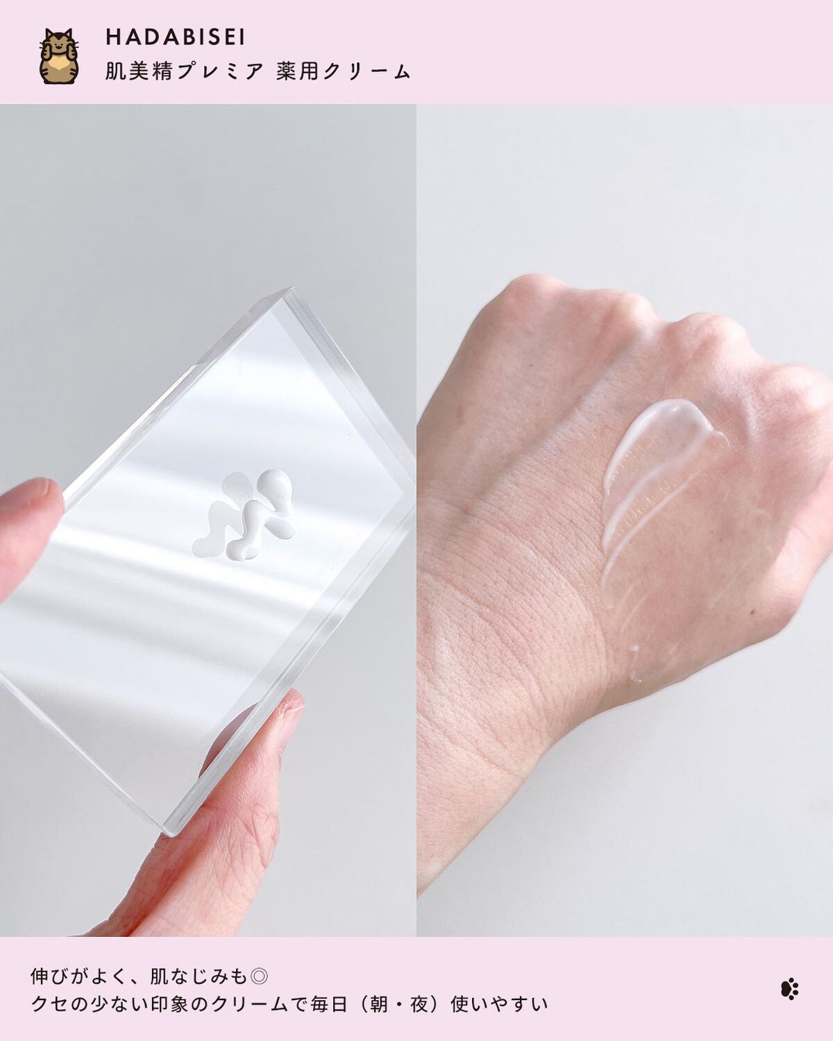容器はジャータイプ。 ほんのり黄みがかったテクスチャーは、やわらかでこっくりしてそうな、ちょっとおいしそうな見た目をしています。 めちゃくちゃ伸びるやん!!! 真珠由来の保湿成分や整肌成分がこれでもかと含まれており、保湿力も◎ ベタつかずしっとり包み込んでくれる使用感です。