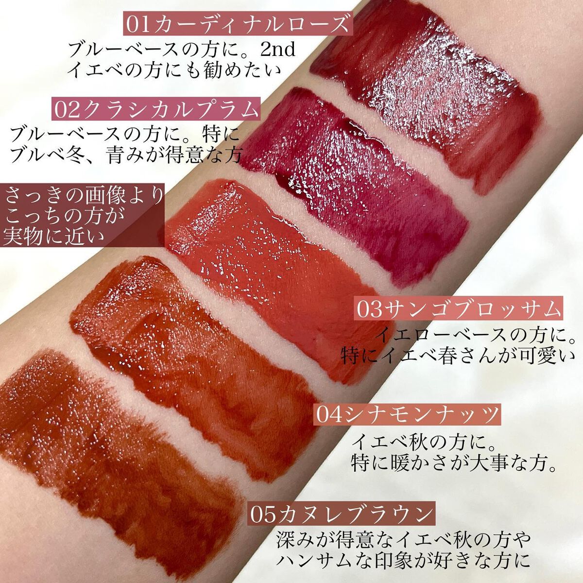 マスクにもつきにくく、色展開も豊富で高級感のあるパッケージ🤩 どれをとっても私は大好きなんですが、皆さんお持ちですか? サロンでも大人気なので現在は12色置いています。 あくまでオススメなので、濃いものは指でポンポン塗ったら春夏の人も使いやすいし、逆に柔らかな色のものも重ねれば濃くなるので、自分の好き!を大事にしてくださいね☺️❤️ ちなみにブルベ夏冬の私(クールサマー)の私は64.66が大好きです!!!!!!💘💘