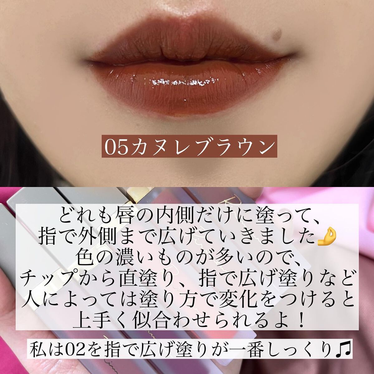 もーーーまずパッケージが可愛すぎるよね😢❤️❤️ 迷いなく全色買ってしまったよ…! 既存のジューシーラスティングティントに比べて ⚪︎サラッとしたリキッド ⚪︎やや薄づきな発色⚪︎艶々? 個人的にはロムアンドでは 最近こそ出るようになったけど ブルベ向きのカラー(特にサマー)でドンピシャが あんまり無いなあと思っていたので、 今回とっっても5〜8番が可愛くて ひじょーーーーーーに!満足しております💪❤️❤️