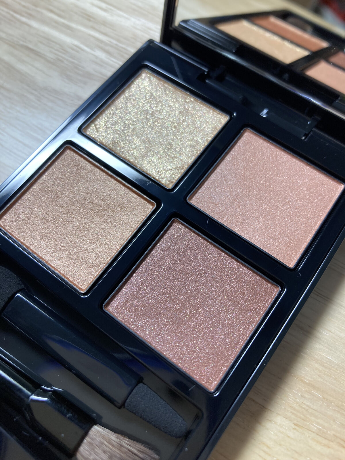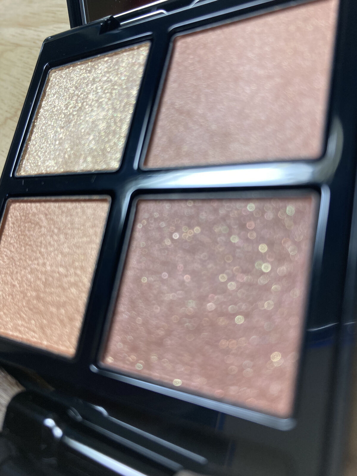 目を綺麗に見せてくれるアイシャドウだと思った。 ナチュラルが好きな方は特にハマるはず。 右下のブラウンが本当に優秀。これだけで単色売りして欲しいくらい。 右上のほぼ白みたいなベージュは、案外良いベースとして馴染む。 左上の白ラメがとても強い。離れても一粒ごとに見分けがつく程ギラギラとする。 左下のブラウンラメは正直そこまで特徴がない。 密着感はデパコスの中では普通。 メイクしてます感が出ないのが使いやすい。 手順がある程度分かりやすいパレットなので迷うことがなく、ある意味時短になる。