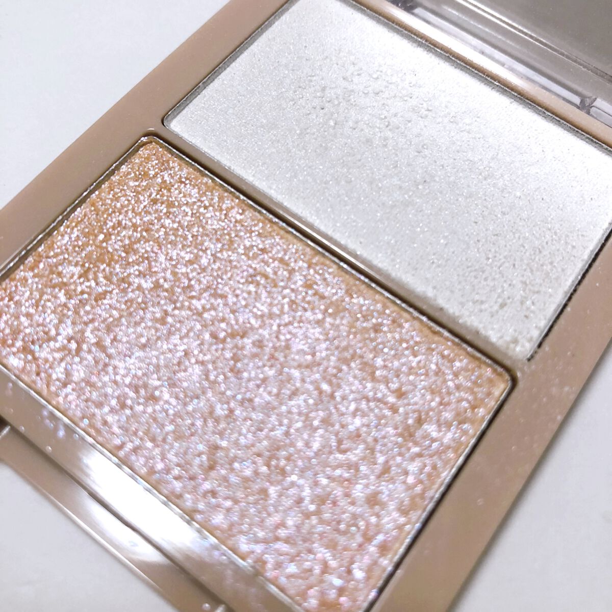 しっとりとした粉質に感動! しっとりとしていて、粉飛びしにくく感じました! 2種類のハイライトが入っていて便利! キラッキラのラメのタイプと、細かいパールがぎっしりと詰まった艶タイプの2種類が1つのパレットに入っています! 500円でこのキラキラ感と艶感はすごいなと思いました! コスパよく、しっかり輝くものを探している方におすすめです!
