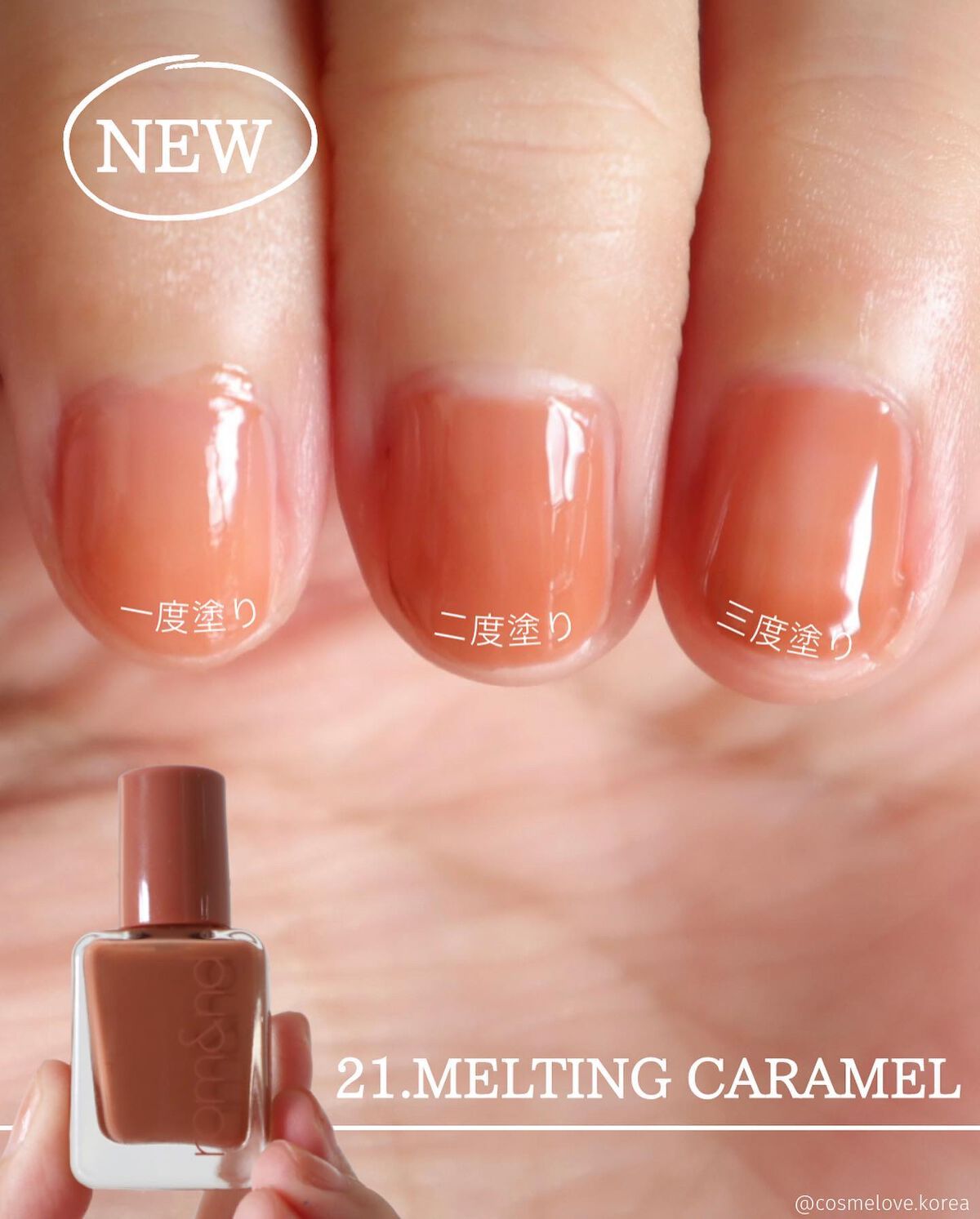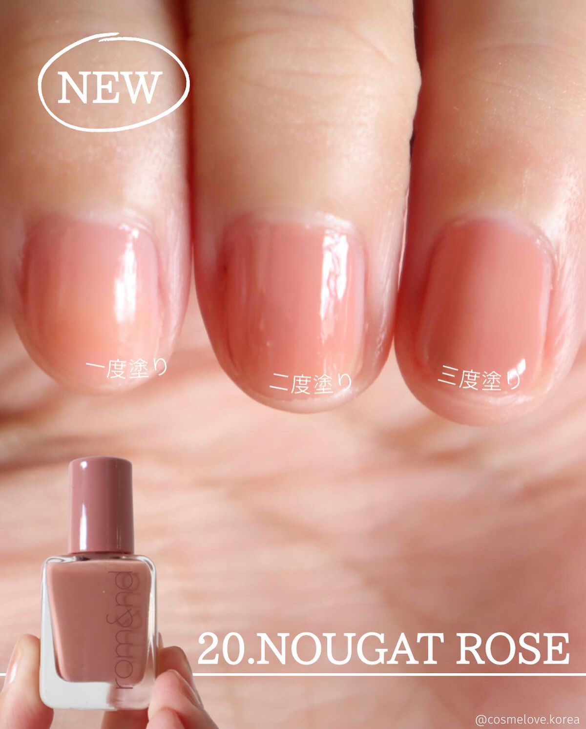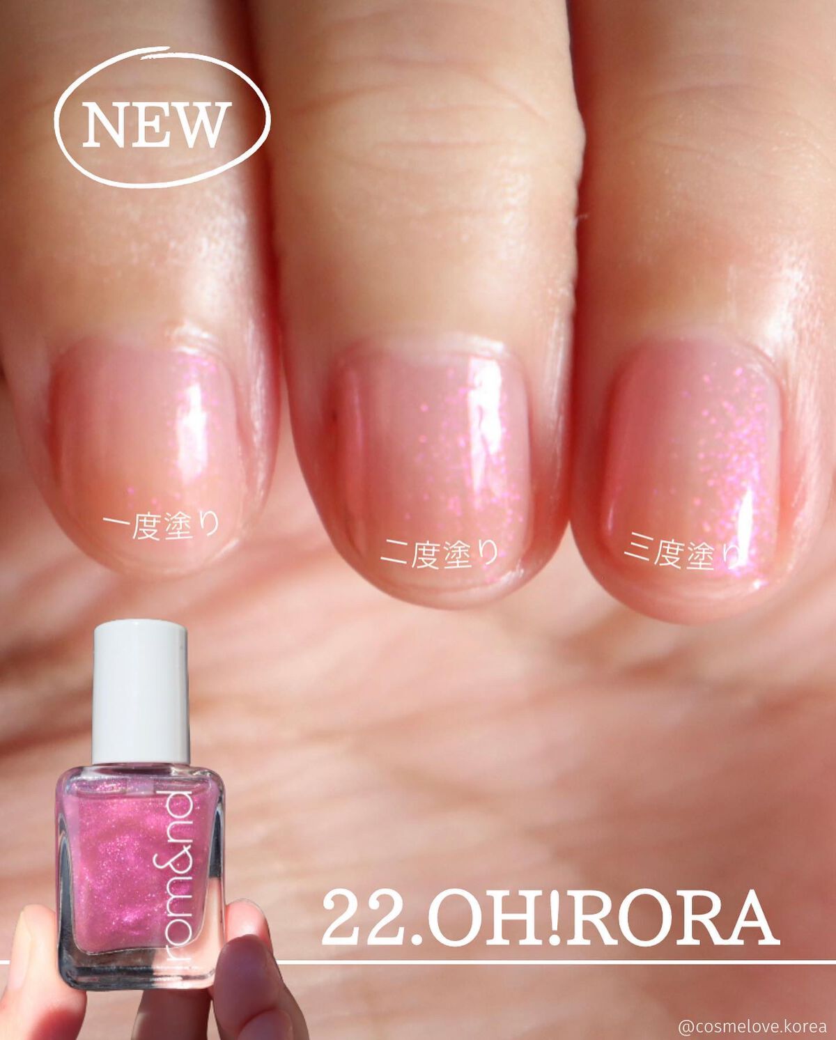 - 指先に玉石のような、ならかな光沢をとどめる。塗った瞬間から綺麗なツヤと光沢を維持し、重ねて塗っても透き通ったカラー感を鮮やかにとどめる、素早い乾燥力のナチュラルカラーネイル。「ロムアンド」の次世代型ネイルです。