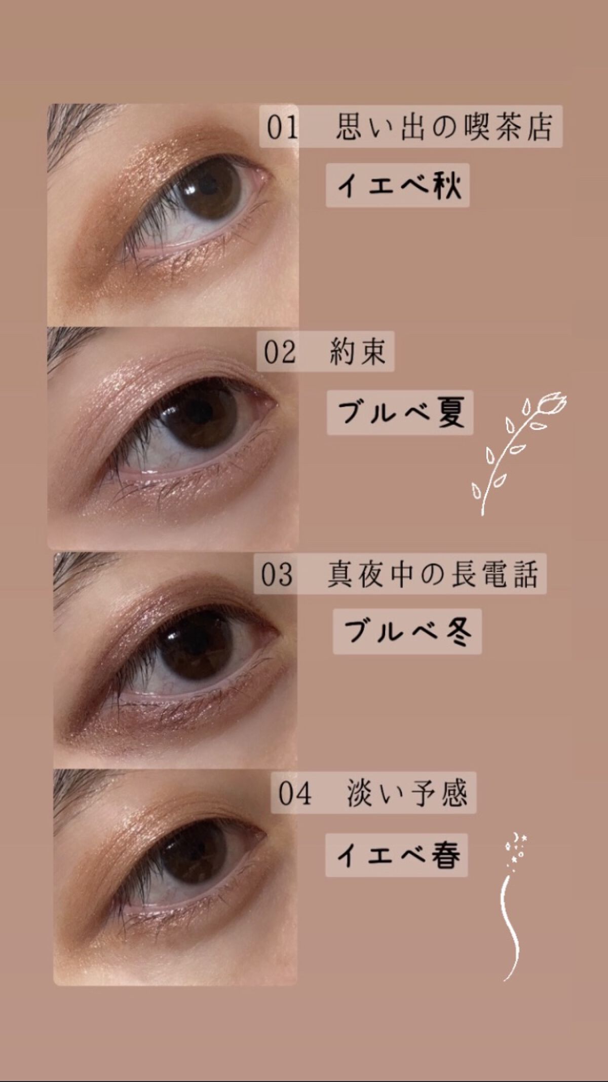 - <01 思い出の喫茶店> 水、BG、シリカ、(スチレン/アクリレーツ)コポリマー、エタノール、ステアリン酸PEG-40、フェノキシエタノール、キサンタンガム、デヒドロ酢酸Na、シメチコン、モモ葉エキス、ローズマリー葉エキス、ヒアルロン酸Na、ホウケイ酸(Ca/Al)、マイカ、酸化鉄、酸化チタン <02 約束> 水、BG、シリカ、(スチレン/アクリレーツ)コポリマー、エタノール、ステアリン酸PEG-40、フェノキシエタノール、キサンタンガム、デヒドロ酢酸Na、水酸化Al、シメチコン、モモ葉エキス、ローズマリー葉エキス、ヒアルロン酸Na、ホウケイ酸(Ca/Al)、マイカ、酸化チタン、酸化鉄 <03 真夜中の長電話> 水、BG、シリカ、(スチレン/アクリレーツ)コポリマー、エタノール、ステアリン酸PEG-40、フェノキシエタノール、キサンタンガム、デヒドロ酢酸Na、シメチコン、モモ葉エキス、ローズマリー葉エキス、ヒアルロン酸Na、ホウケイ酸(Ca/Al)、マイカ、酸化チタン、酸化鉄 <04 淡い予感> 水、BG、シリカ、(スチレン/アクリレーツ)コポリマー、エタノール、ステアリン酸PEG-40、フェノキシエタノール、キサンタンガム、デヒドロ酢酸Na、水酸化Al、シメチコン、モモ葉エキス、ローズマリー葉エキス、ヒアルロン酸Na、ホウケイ酸(Ca/Al)、マイカ、酸化チタン、酸化鉄 <06 強がり> 水、BG、シリカ、(スチレン/アクリレーツ)コポリマー、エタノール、ステアリン酸PEG-40、フェノキシエタノール、キサンタンガム、デヒドロ酢酸Na、クエン酸、シメチコン、水酸化Al、モモ葉エキス、ローズマリー葉エキス、ヒアルロン酸Na、ホウケイ酸(Ca/Al)、マイカ、酸化鉄、酸化チタン