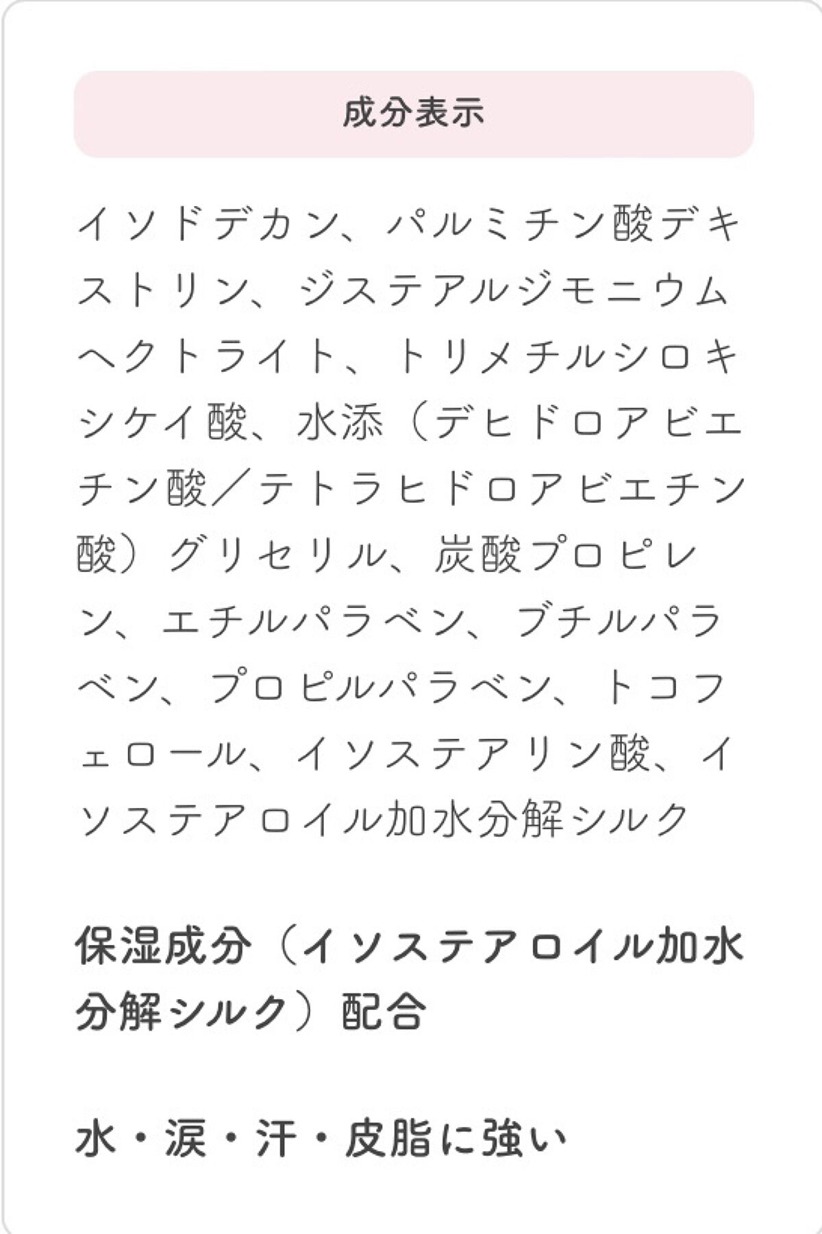 - <透明タイプ> イソドデカン、パルミチン酸デキストリン、ジステアルジモニウムヘクトライト、トリメチルシロキシケイ酸、水添(デヒドロアビエチン酸/テトラヒドロアビエチン酸)グリセリル、炭酸プロピレン、エチルパラベン、ブチルパラベン、プロピルパラベン、トコフェロール、イソステアリン酸、イソステアロイル加水分解シルク <BK ブラック> イソドデカン、トリメチルシロキシケイ酸、合成ワックス、(パルミチン酸/エチルヘキサン酸)デキストリン、トリイソステアリン酸ポリグリセリル-2、ジステアルジモニウムヘクトライト、水添(デヒドロアビエチン酸/テトラヒドロアビエチン酸)グリセリル、マイクロクリスタリンワックス、パルミチン酸デキストリン、フェノキシエタノール、トコフェロール、スクワラン、パンテニルエチル、ラウロイルグルタミン酸ジ(フィトステリル/オクチルドデシル)、イソステアリン酸、水、ジラウロイルグルタミン酸リシンNa、イソステアロイル加水分解シルク、酸化鉄 <BR ブラウン> イソドデカン、トリメチルシロキシケイ酸、合成ワックス、(パルミチン酸/エチルヘキサン酸)デキストリン、トリイソステアリン酸ポリグリセリル-2、ジステアルジモニウムヘクトライト、水添(デヒドロアビエチン酸/テトラヒドロアビエチン酸)グリセリル、マイクロクリスタリンワックス、パルミチン酸デキストリン、フェノキシエタノール、トコフェロール、スクワラン、パンテニルエチル、ラウロイルグルタミン酸ジ(フィトステリル/オクチルドデシル)、イソステアリン酸、水、ジラウロイルグルタミン酸リシンNa、イソステアロイル加水分解シルク、酸化鉄 <BO ベイクドオレンジ > イソドデカン、トリメチルシロキシケイ酸、合成ワックス、(パルミチン酸/エチルヘキサン酸)デキストリン、トリイソステアリン酸ポリグリセリル-2、ジステアルジモニウムヘクトライト、マイクロクリスタリンワックス、水添(デヒドロアビエチン酸/テトラヒドロアビエチン酸)グリセリル、パルミチン酸デキストリン、フェノキシエタノール、トコフェロール、スクワラン、パンテニルエチル、ラウロイルグルタミン酸ジ(フィトステリル/オクチルドデシル)、イソステアリン酸、水、ジラウロイルグルタミン酸リシンNa、イソステアロイル加水分解シルク、酸化鉄 <WM ワインモーヴ> イソドデカン、トリメチルシロキシケイ酸、合成ワックス、(パルミチン酸/エチルヘキサン酸)デキストリン、トリイソステアリン酸ポリグリセリル-2、ジステアルジモニウムヘクトライト、マイクロクリスタリンワックス、水添(デヒドロアビエチン酸/テトラヒドロアビエチン酸)グリセリル、パルミチン酸デキストリン、フェノキシエタノール、トコフェロール、ジメチコン、シリカ、ハイドロゲンジメチコン、スクワラン、パンテニルエチル、ラウロイルグルタミン酸ジ(フィトステリル/オクチルドデシル)、イソステアリン酸、水、ジラウロイルグルタミン酸リシンNa、イソステアロイル加水分解シルク、酸化鉄、グンジョウ、マイカ、酸化チタン、赤226