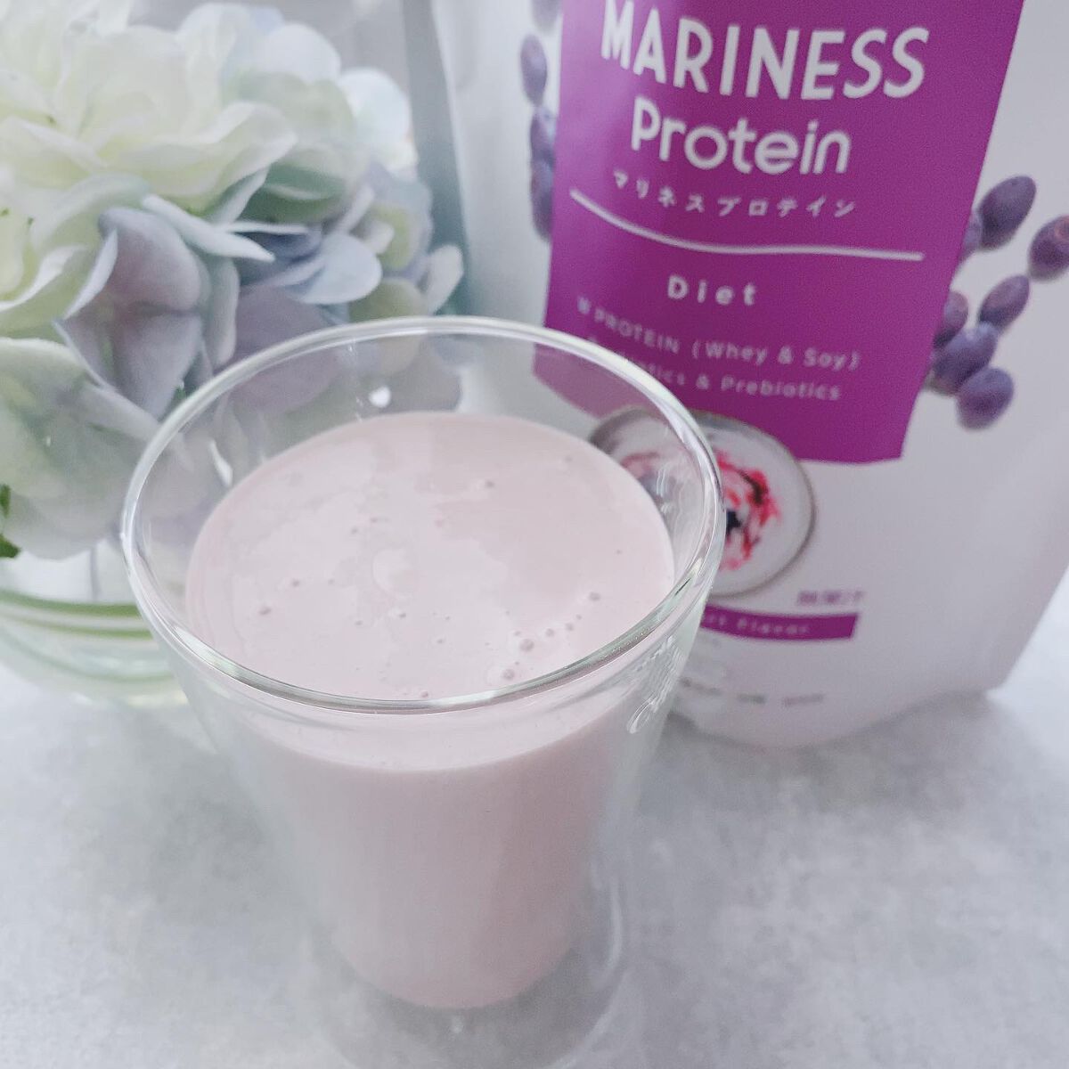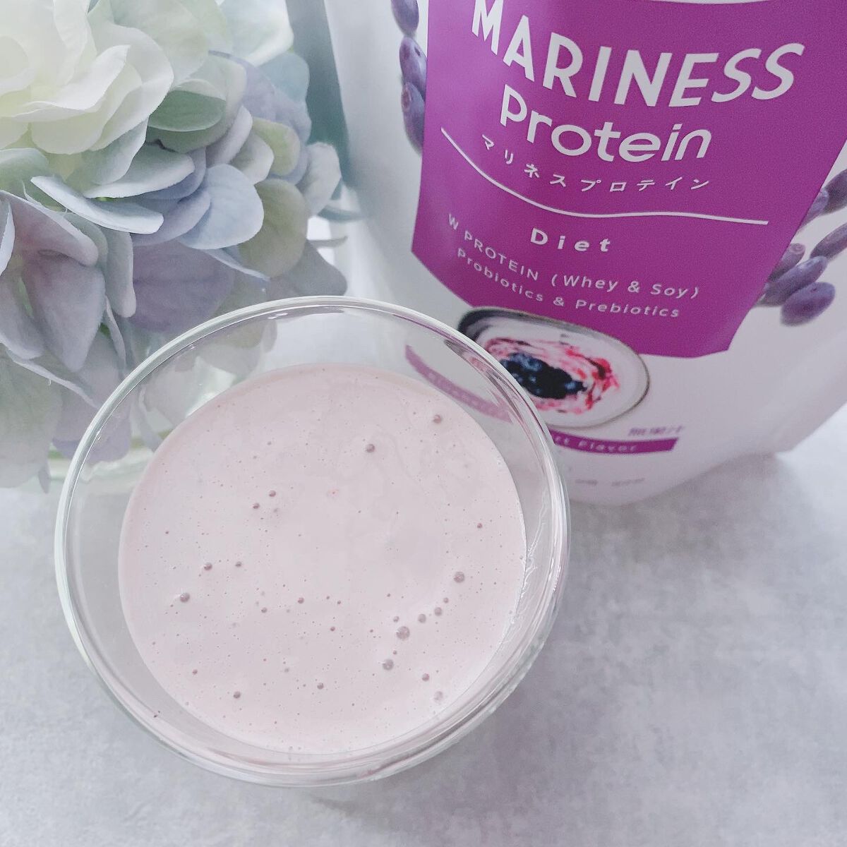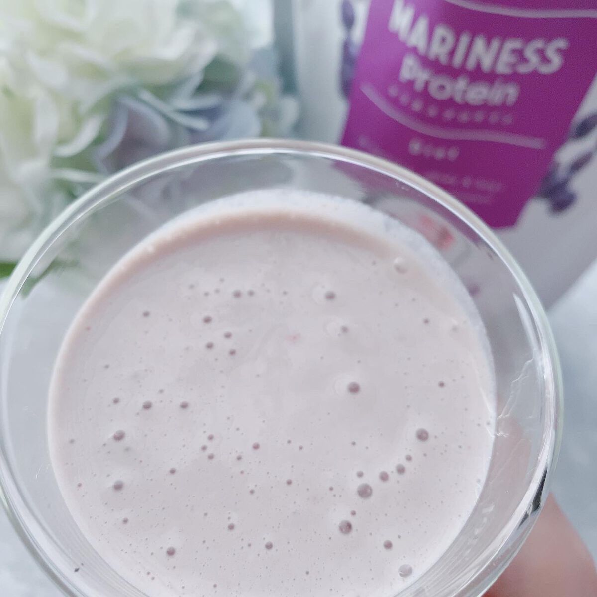 私の大好きなマリネスのプロテイン! プロテインはマリネス!な我が家は今までバナナ、チョコ、ブルーベリーヨーグルト、抹茶ラテ、ロイヤルミルクティー、黒ゴマきなこほぼ全制覇するんじゃないかくらいリピートしています🥰 甘みの中に、少し酸味も感じられるので甘ったるくなく、くどくないから飲みやすい🙆♀️ マリネスのいいところは溶けやすいこと!粉っぽさがなく良き◎腹持ちの良さも◎置き換えしたい人にもいい🙌
