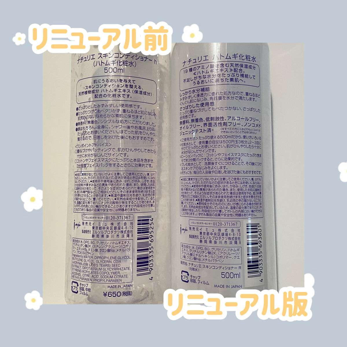 - <通常サイズ 500ml> 水、DPG、BG、グリセリン、ハトムギエキス、グリチルリチン酸2K、(スチレン/VP)コポリマー、クエン酸、クエン酸Na、メチルパラベン <500ml+ 限定ムーミンデザインボトル> 水、DPG、BG、グリセリン、ハトムギエキス、グリチルリチン酸2K、(スチレン/VP)コポリマー、クエン酸、クエン酸Na、メチルパラベン <詰め替えタイプ 480ml> 水、DPG、BG、グリセリン、ハトムギエキス、グリチルリチン酸2K、(スチレン/VP)コポリマー、クエン酸、クエン酸Na、メチルパラベン <旧製品> BG、グリセリン、メチルパラベン、エタノール、グリチルリチン酸2K、ハトムギエキス、DPG、クエン酸Na、プロピルパラベン、クエン酸、(スチレン/アクリレーツ)コポリマー、水 <限定ムーミンデザイン> 水、DPG、BG、グリセリン、ハトムギエキス、グリチルリチン酸2K、(スチレン/VP)コポリマー、クエン酸、クエン酸Na、メチルパラベン