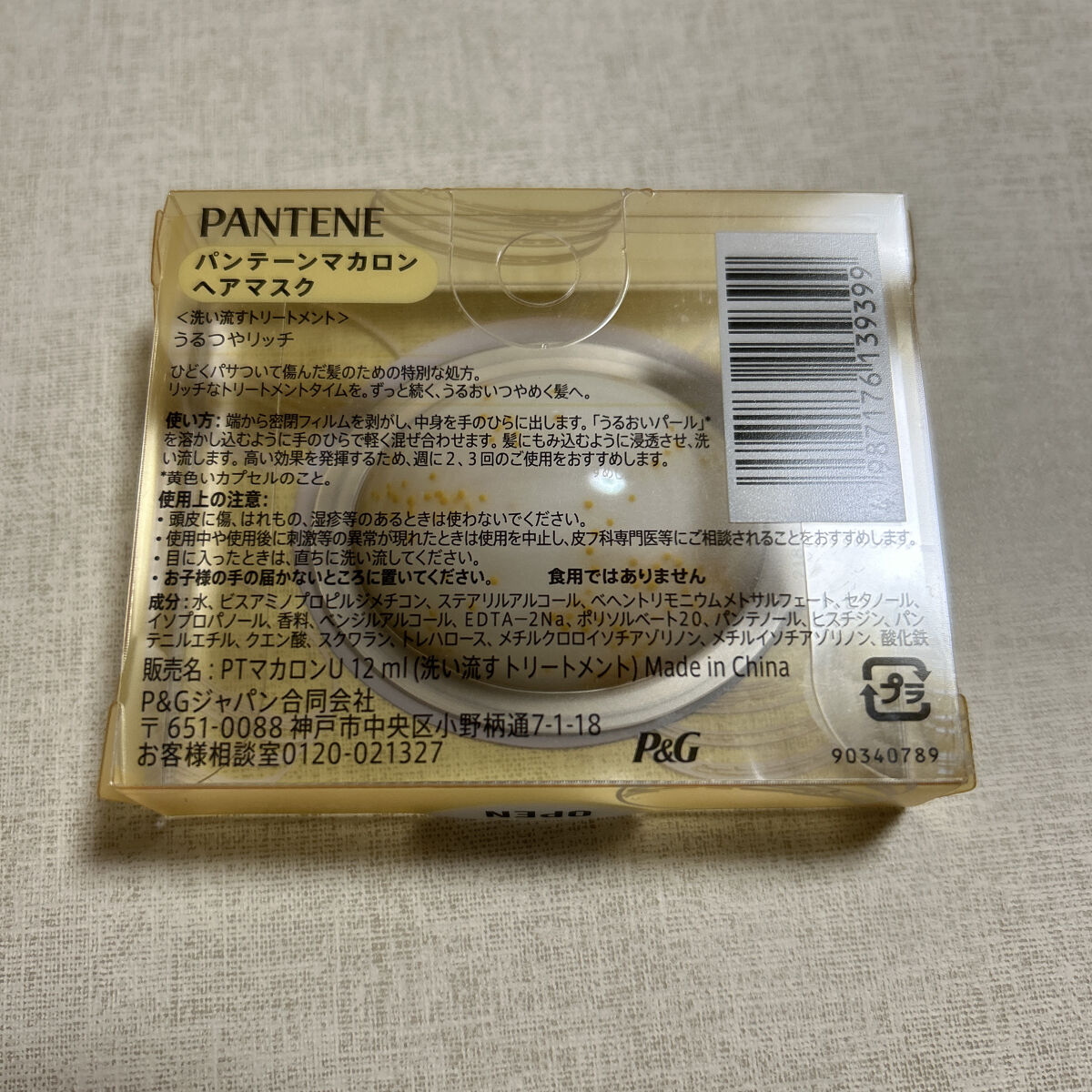 - 「パンテーン マカロン ヘアマスク」は、1粒に1回分の洗い流すトリートメントがたっぷり詰まった、使い切りタイプのヘアマスクです。 マカロンのようなカプセル型のユニークなパッケージの可愛さのみならず、個包装の使い切りタイプによる3つの特長で、たった1粒で、ずっと続く、うるおいつめく髪/色つや髪へ導きます。 1.1粒にたっぷりの洗い流すトリートメントをギュッと濃縮。すぐに感じる、もっとまとまる髪へ! 「パンテーン マカロン ヘアマスク」は、1粒にたっぷり12mLの洗い流すトリートメントが入っています。様々な髪の長さ、量の方でも髪の内側までしっかりと塗布することができ、効果を発揮します。 たっぷりの量を使用することで、髪のまとまり感がアップ。 2.いつでも開けたて、フレッシュな洗い流すトリートメント カプセル型のパッケージに入った個包装の1回使い切りなので、いつでも開けたてのフレッシュさ。 毎回、使う直前に手のひらで“メルティうるおいパール*”を混ぜ合わせて、1粒で、長時間続くうるおいつやめく髪へ。(うるつやリッチのみ) *黄色いカプセルのこと 3.個包装だから持ち運びOK。いつでもどこでも、うるつや髪・色つや髪に 日々のケアはもちろん、1粒ずつ持ち運ぶことが出来るので、ジムやサウナ、お泊り会、旅行・出張など、様々なシーンで使うことが出来ます。いつでも・どこでもうるつや髪/色つや髪に。