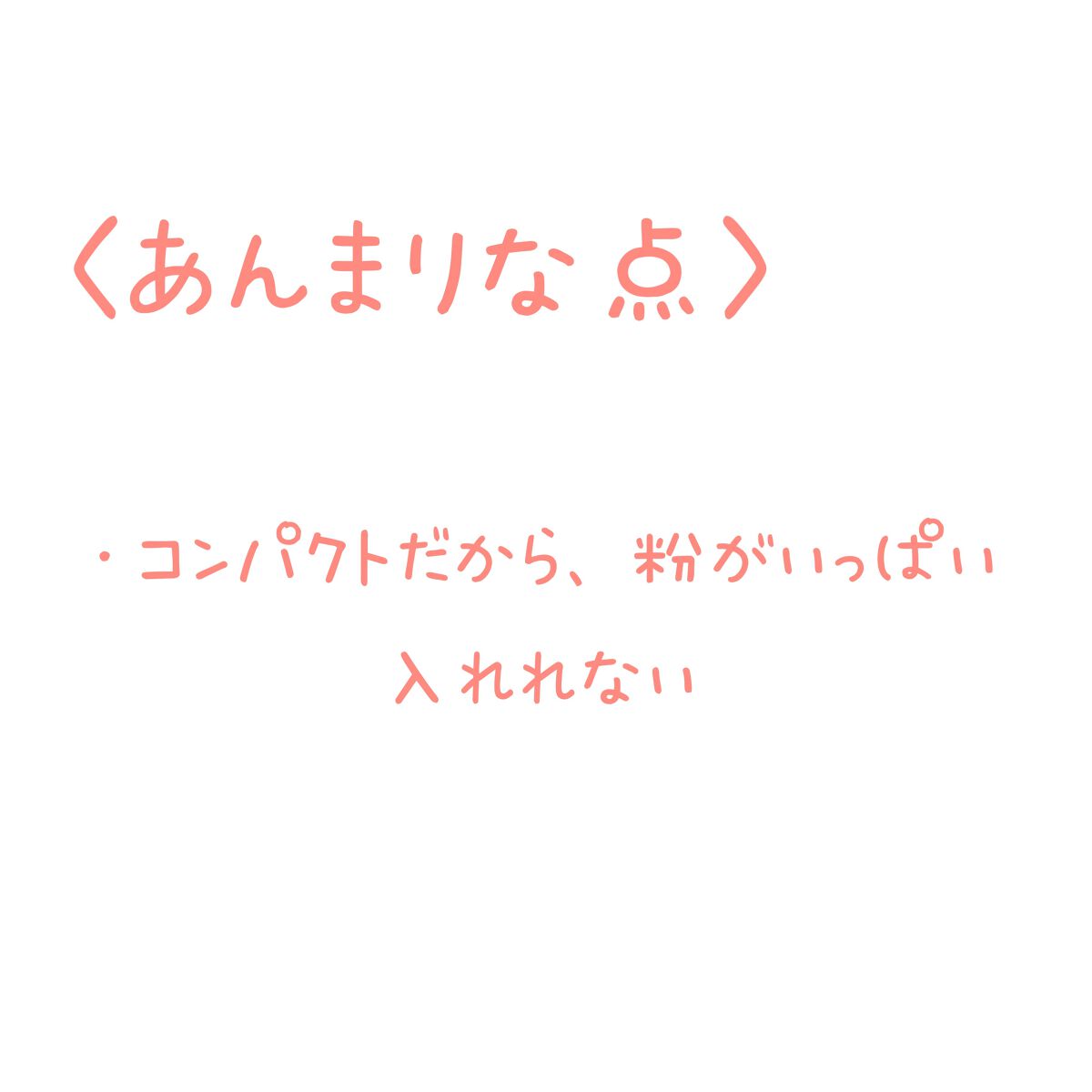 パフ自体がとても柔らかく、肌に当ててもチクチクしないこと。 敏感肌の方でも安心して使えるかもしれません☁️ 粉を入れても、最初はなかなか出てこなくて、何度か重ねてやっとパウダーがつく感じ💦その粉も大量に入れないといけない💦 ナチュラルメイクを好む方や部分使いで軽くメイク直しをしたい方にはおすすめです🎶