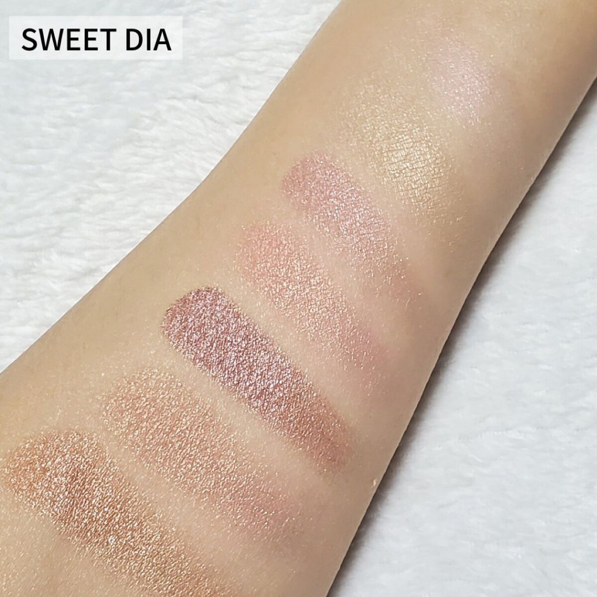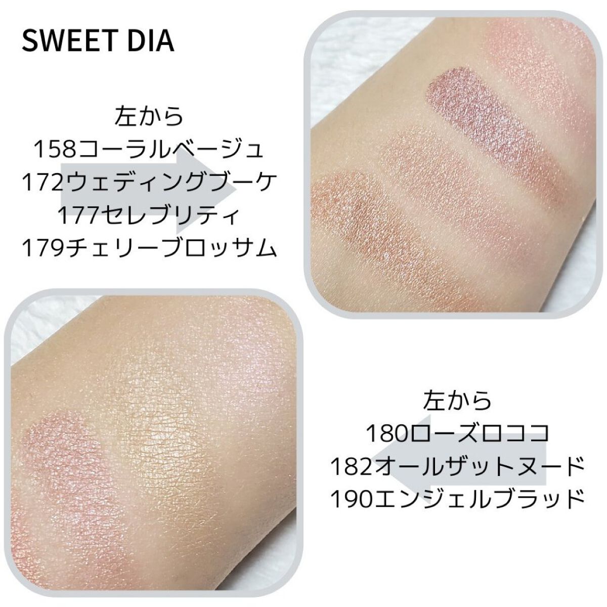 こう見ると圧倒的にシマーラメ系のSWEET DIAが多いですね。やっぱり私の目はマットだけだとシワが目立つのでシマーは大事ですw シェーディングにも使えるマカロングレー、深みのローズブラウンですね。 SWEET DIAは下まぶたにはウェディングブーケがかわいいし、オールザットヌードやエンジェルブラッドはベースにも向いてるシマーだと思います。パッと明るくなる。 SPARKLE SPOTは黒目上にチョンとのせるだけで優勝です。どっちもすごいかわいい。レッドソルト~は名前の通りピンクラメにチラチラ赤い粉が混じっててかわいい。