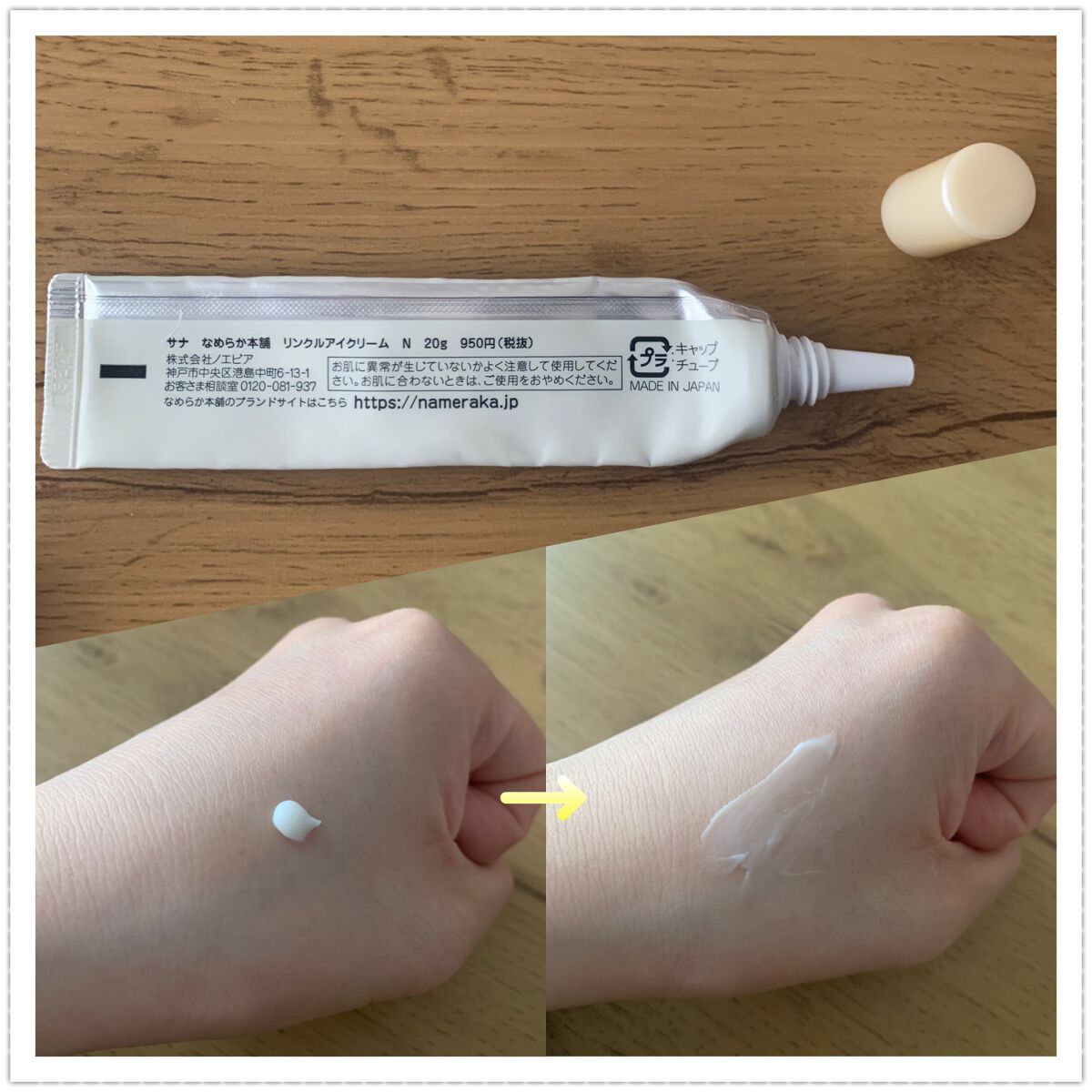 - ピュアレチノール※を新配合!濃厚アイクリームでもっちりハリeyes ※ 保湿成分 「リンクルアイクリーム N」は、『なめらか本舗』オリジナルの豆乳発酵液*1に加え、ピュアレチノール*1とビタミンE誘導体*2を新配合したもっちりとしたハリのある目元に導く「アイクリーム」です。 密着ポリマーがお肌の上で均一な膜を形成し、目元のハリ感をサポート。 毎日のスキンケアに取り入れていただくことで、年齢の出やすい目元をしっかりケアします。 〔①ピュアレチノール*1×豆乳発酵液*1×ビタミンE誘導体*2配合〕 「なめらか本舗」オリジナルのイソフラボン含有の豆乳発酵液*1に加え、ピュアレチノール*1を新配合。 さらに、ビタミンE誘導体(TPNaⓇ)*2も配合し、年齢の出やすい目元をしっかりケアします。 ・ピュアレチノール:ビタミンAの一種でハリのある目元に! ・豆乳発酵液:弾力感・うるおいを与えふっくらした目元に! ・ビタミンE誘導体(TPNaⓇ):お肌にぐんぐん浸透*3してイキイキした目元に! 〔②密着ポリマーで目元にハリ感〕 密着ポリマーがお肌の上で均一な膜を形成します。もっちりとハリのある目元に導きます。 *1 保湿成分 *2 トコフェリルリン酸Na(保湿成分) *3 角層まで