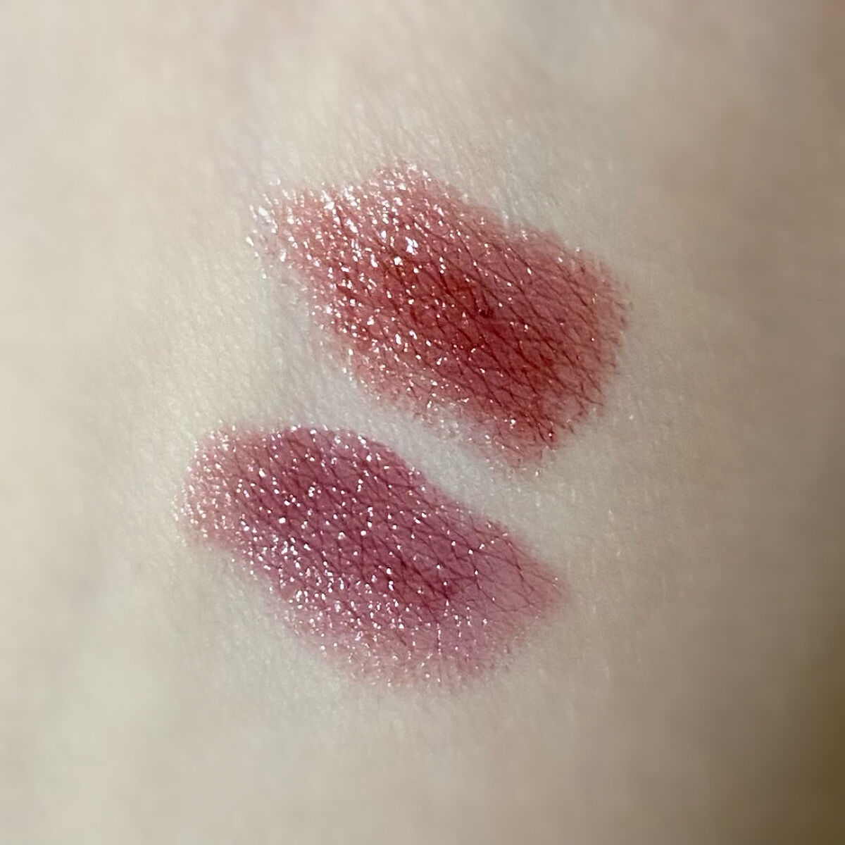 発色は一度塗りだと透け感がある感じで 重ねれば重ねるだけよく発色します。 ツヤ感のあるリップでスルスルと塗れます。 ツヤ仕上がりでティントでもないので 色持ちは喋ってるだけで一瞬で落ちるというわけではないですが 飲食をしたら普通に落ちますし マスクにもつきます。 個人的にこのリップで苦手なのはにおいです。 我慢できないほどではないのですが THE化粧品といいますか マダム感といいますか..