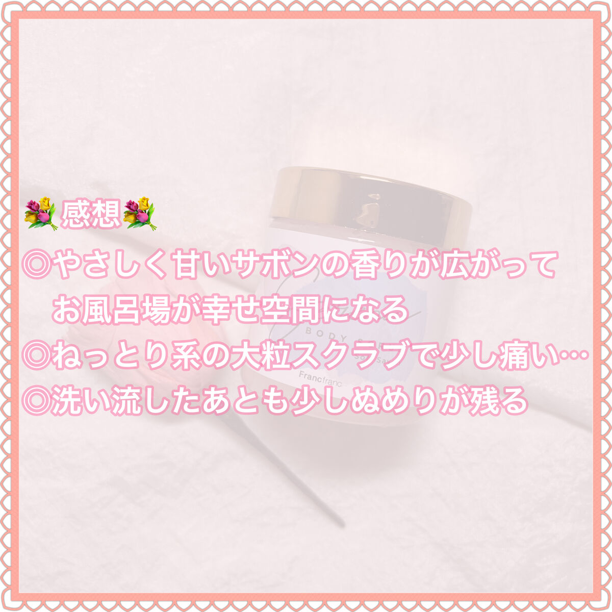 自分時間を楽しむためのリラックスタイム🛁フランフランのボディスクラブ🩷こちらはラベンダーの香り🪻 しっかりラベンダーの香りがします💜精油のような香りがお風呂に広がり、心身ともに癒されます☺️350gとたっぷり使えます。スクラブは細かくてなめら...