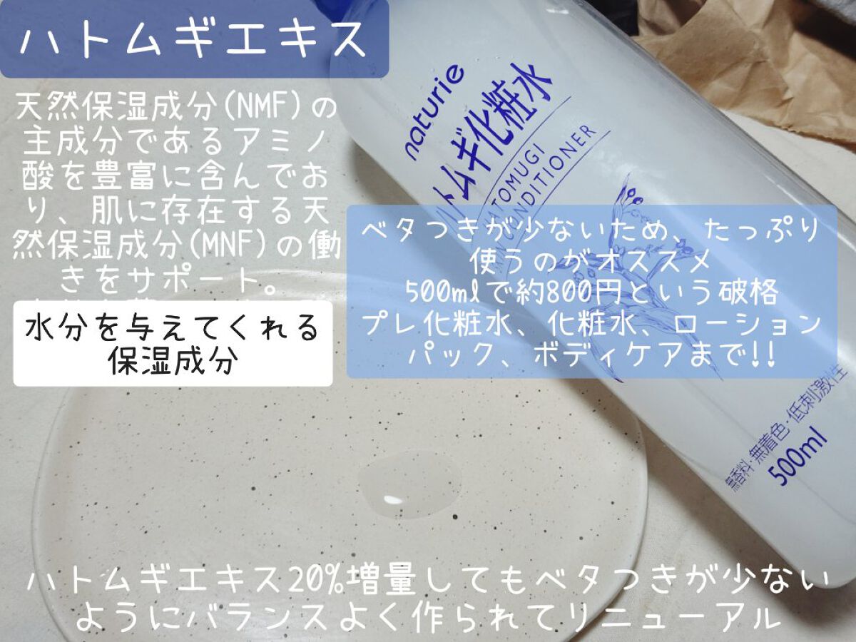 ハトムギエキス20%増量で保湿力UP →天然植物由来の保湿成分ハトムギエキスを従来品より20%増量 アルコールフリーに →毎日快適に使いやすいアルコールフリーになった テクスチャーはみずみずしくベタつかない 肌にスーッと馴染んでくれる