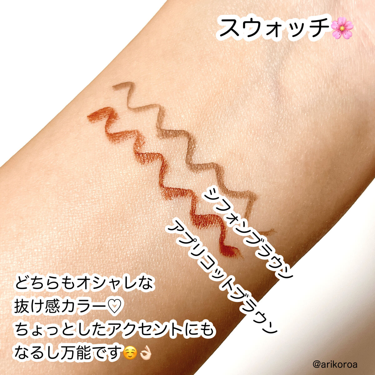 - 筆先までずっとなめらか、目尻で感動するリキッドアイライナー。 必要な量が肌にのる新設計で、まぶたの上をすべるような、滑らかな描き心地。しなやかでコシのある筆が、筆圧のコントロールを容易にし、太いラインも細いラインも思い通りに仕上げます。水、汗、涙に強いウォータープルーフタイプなのに、通常洗顔で簡単オフ。肌に色素が残らない顔料を使用。5種類の美容液成分を従来品の200%配合し、メイクしながら目元ケアまで。 ●ブラウンブラック ※2020年9月12日 バラエティショップ先行発売 ●漆黒ブラック ※2020年12月頃発売予定 ●ナチュラルブラウン ※2020年12月頃発売予定 ●シフォンブラウン 「毎日メイクに透明感と抜け感」 ブラウンでも、グレーでも、ベージュでもないニュアンスカラー。 自然な印影で素の目元を際立て、頑張りすぎない、ふんわりとした目元に。 ●アプリコットブラウン 「じゅわっと血色感。 肌に馴染むおしゃれカラー」 温かみのあるアプリコットがじゅわっと滲む血色感を目元に演出。 肌馴染みが良いので、カラーライナーに抵抗がある方もブラウンの延長線上で楽しめる、使いやすい色味です。 ”ちょっとオシャレ”な空気感を演出するカラー。 ●ピンクショコラ アイライナー 「ピンクが溶け込む濃厚ブラウン」 肌馴染みが良く、目元にじんわり血色感をプラス。 さりげなく女性らしさが加速するようなカラー。 ●ピスタチオラテ (2022年7月29日(金)発売) 「“目尻”に抜け感アクセント」 肌に馴染むのに映える絶妙なグリーン。 トレンドカラーに“くすみ”と“抜け感”をプラスしたまろやかな発色。 ●マスタードブラウン 「“イエロー”が揺れる、大人の洒落色」 (2022年7月29日(金)発売) まるで太陽のような暖かさを感じる新しいブラウン。 ほんのり感じるイエローでメイクが一気に垢抜ける稀有な色。 ●シフォンピンク(2023年2月10日発売) 「ふんわり柔らか"まろみピンク"」 甘くなりすぎない青みニュアンスで目元の透明感UP。 目元を引き締め、ピンクメイクにありがちな腫れぼったさを解消。 ●ミルクカプチーノ(2023年4月21日発売) まろやかな深みの“優しい締め色” どんなメイクにも合わせやすいカラー。 自然な陰影でさりげなく目幅を拡張します。 ●グレーカシミア(2023年10月1日発売) ブラウンがほんのり溶け込んだ、暖色グレー まろやかな発色で、パーソナルカラーを問わず肌に馴染む 目元の陰影になりすまし、抜け感と目力を欲張りに叶える ●ダークフィグ(2024年6月1日発売) するする”なめらか。描きやすいのに、落ちにくい。 クッキリ可愛いほの甘ダークブラウン ●ピーチモカ(2024年8月1日発売) ふわっと自然に盛れる“桃色ブラウン” ほんのり血色感で目元にうるみ感を演出 ●スターダストブラウン(2024年12月11日発売) キラッと繊細に輝く''星屑ブラウン'' 透け感のあるダークブラウンの色味とラメの輝きが、目元に艶のある立体感を演出 ●チャコールモカ(2025年4月10日発売) 目元を締める''深みグレージュ'' 黄みや赤みに偏りすぎない絶妙な色設計で、自然に目元を強調