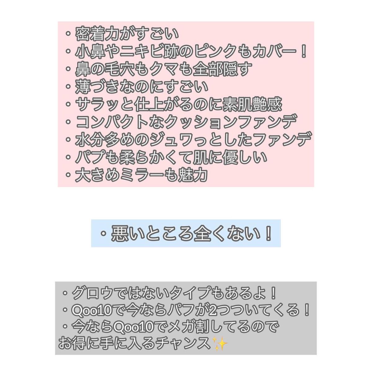 私はいつも標準色が肌の色に合うのですが、今回は22番が合います。 ・パケは、シルバーのキラキラで高級感があります。中にも大きなミラーがついています。また、パフも雫の様な形でおしゃれです。 中がスポンジではなく、網の様になっていてパフで強く押してしまうとベチャっとなって内蓋について汚くなってしまいました、、、 また、ファンデが戻らないので使い物にならなくなってしまいました、、、、 ・香りは、ツボクサエキス配合だけどファンデの香り!って感じです。 ・使い心地は、みずみずしくて伸びがいいです。パフで叩くと肌に密着する感じが分かりました。また、薄くつくのでナチュラル感がありました! ニキビやクマが酷い方は、コンシーラーの上にこちらを使う事をおすすめします。