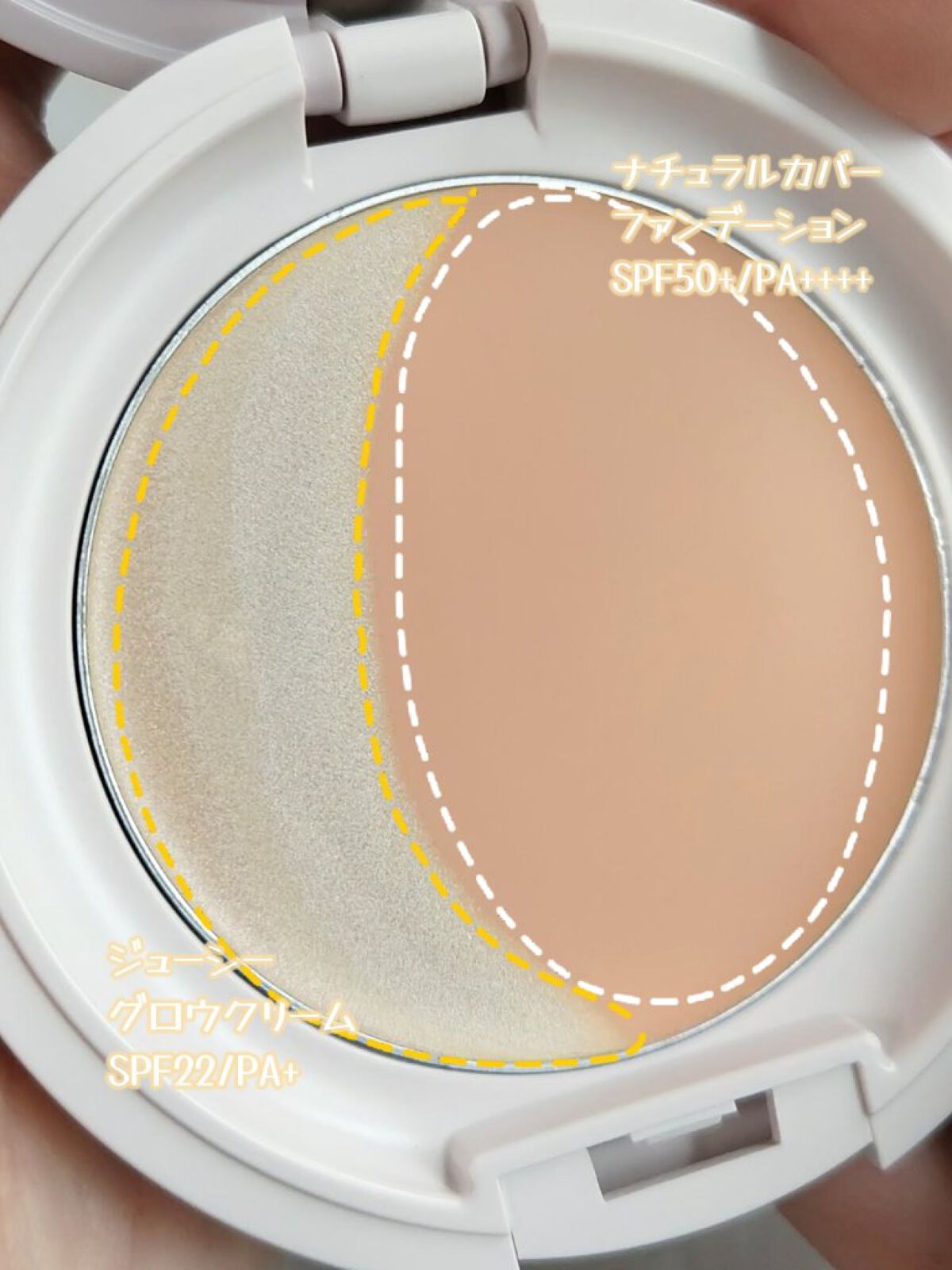 - ツヤとカバーの2種のベースが1つになった 2in1ツヤ肌パクト 繊細な白パールをたっぷり配合した上品なジューシーグロウクリームと パール無配合で肌悩みを自然にカバーするナチュラルカバーファンデーションの、2in1構造! ツヤを好きなだけ自由にのせて、自分好みのツヤ肌を叶えてください♡ 美容オイル配合で、まるでスキンケアしたてのようなちゅるちゅるお肌が続きます。