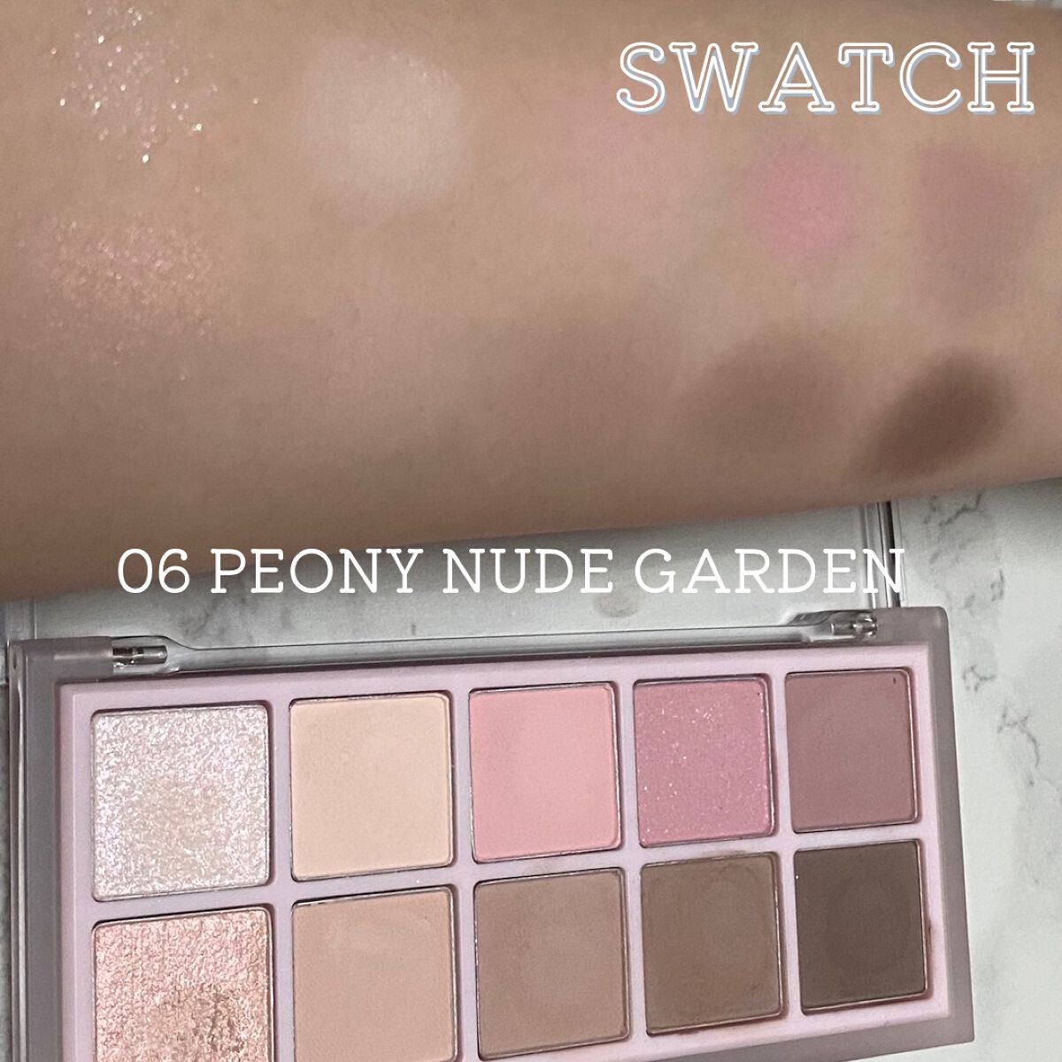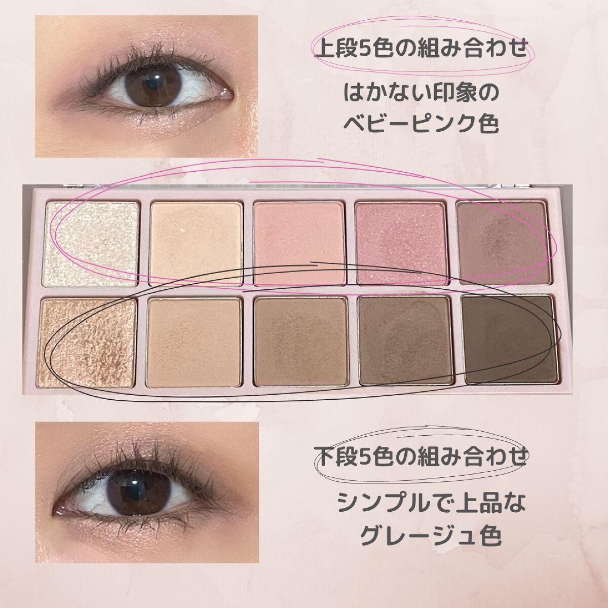 グレーが強く出ました。 なぜかピンクが発色しにくい肌質なのでもっとピンク感が出る方もいるかな? いちばん下の濃いブラウン以外すべてラメ入りです全体的にキラキラした仕上がりになります かなり粉が細かくしっとりしていて密着します! パレット見たまま発色します右上のグレージュカラーのみ色があまり乗らず青の偏光ラメがアクセントになります 粉質が最高! ラメがうるさくない もちがよい 思ったより暗めな仕上がり