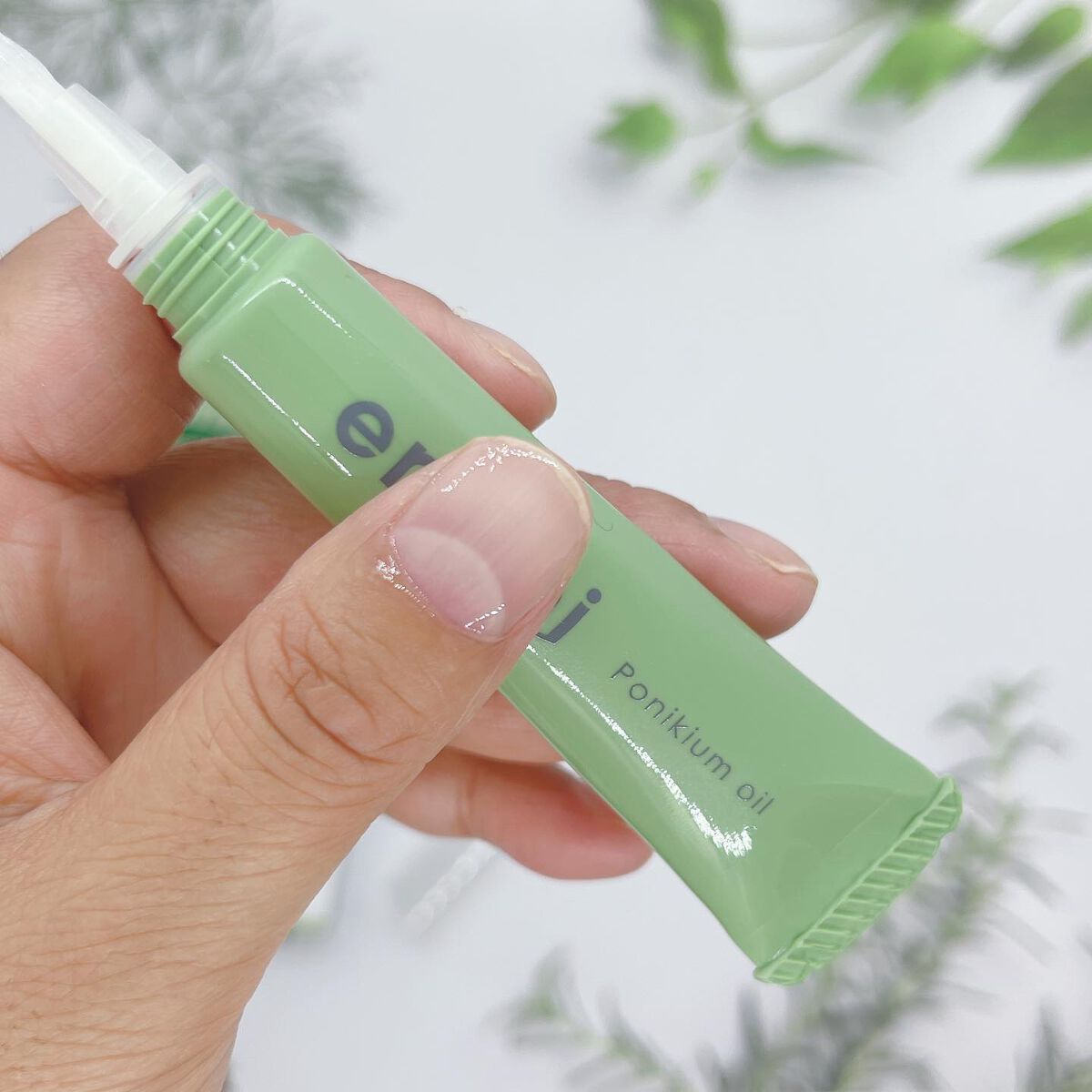 3種のハーブエキスで指先の肌荒れを防ぐ ツボクサエキス、ヨモギ葉エキス、ドクダミエキス(すべて保湿成分)配合 ブラシタイプなので手を汚さずサッと塗れて持ち運びにも便利!気になった時にすぐ使えるのが嬉しい🙌 ジェルオイルなのでベタベタしすぎず、たれにくい。爪先に留まってしっかりと保湿されている感じ◎