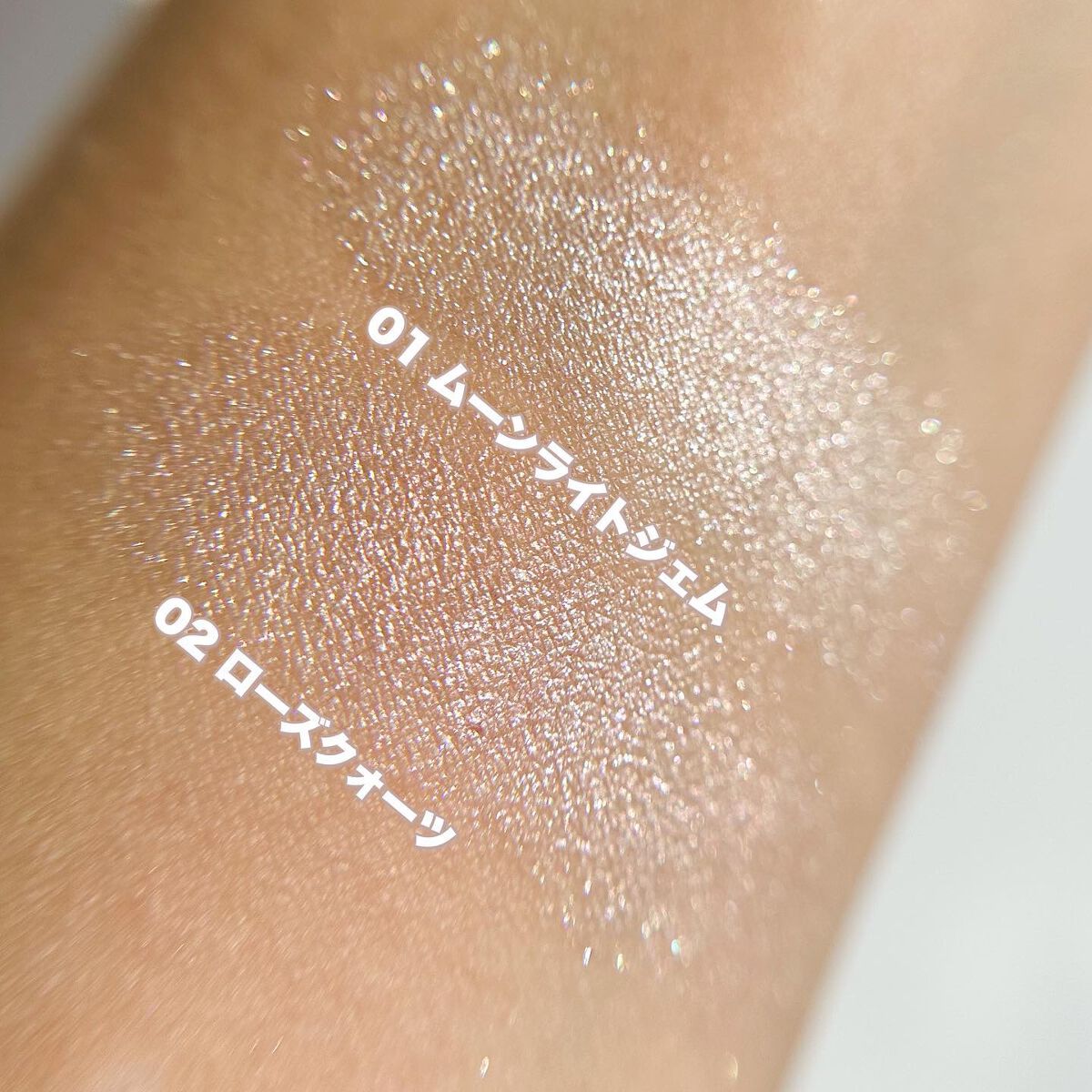 - <01 ムーンライトジェム> トリエチルヘキサノイン、合成フルオロフロゴパイト、ジメチコン、リンゴ酸ジイソステアリル、(ジメチコン/ビニルジメチコン)クロスポリマー、シリカ、スクワラン、オリーブ果実油、セラミドNP、ホホバ種子油、カニナバラ果実油、パルミチン酸レチノール、ツボクサ葉エキス、BG、マイクロクリスタリンワックス、パラフィン、トコフェロール、フェノキシエタノール、メチルパラベン、ジパルミチン酸アスコルビル、酸化チタン、酸化鉄、水酸化Al、酸化スズ <02 ローズクォーツ> トリエチルヘキサノイン、合成フルオロフロゴパイト、ジメチコン、リンゴ酸ジイソステアリル、(ジメチコン/ビニルジメチコン)クロスポリマー、シリカ、スクワラン、オリーブ果実油、セラミドNP、ホホバ種子油、カニナバラ果実油、パルミチン酸レチノール、ツボクサ葉エキス、BG、マイクロクリスタリンワックス、パラフィン、トコフェロール、フェノキシエタノール、メチルパラベン、ジパルミチン酸アスコルビル、マイカ、酸化チタン、酸化鉄、赤202、水酸化Al、酸化スズ <03 ウォームルチル> トリエチルヘキサノイン、ジメチコン、合成フルオロフロゴパイト、リンゴ酸ジイソステアリル、(ジメチコン/ビニルジメチコン)クロスポリマー、シリカ、スクワラン、オリーブ果実油、セラミドNP、ホホバ種子油、カニナバラ果実油、パルミチン酸レチノール、ツボクサ葉エキス、BG、マイクロクリスタリンワックス、パラフィン、トコフェロール、フェノキシエタノール、メチルパラベン、ジパルミチン酸アスコルビル、マイカ、酸化チタン、酸化鉄、水酸化Al、酸化スズ <04 ブルートパーズ> トリエチルヘキサノイン、ジメチコン、合成フルオロフロゴパイト、リンゴ酸ジイソステアリル、(ジメチコン/ビニルジメチコン)クロスポリマー、シリカ、スクワラン、オリーブ果実油、セラミドNP、ホホバ種子油、カニナバラ果実油、パルミチン酸レチノール、ツボクサ葉エキス、BG、マイクロクリスタリンワックス、パラフィン、トコフェロール、フェノキシエタノール、メチルパラベン、ジパルミチン酸アスコルビル、マイカ、酸化チタン、コンジョウ、グンジョウ、水酸化Al、酸化スズ