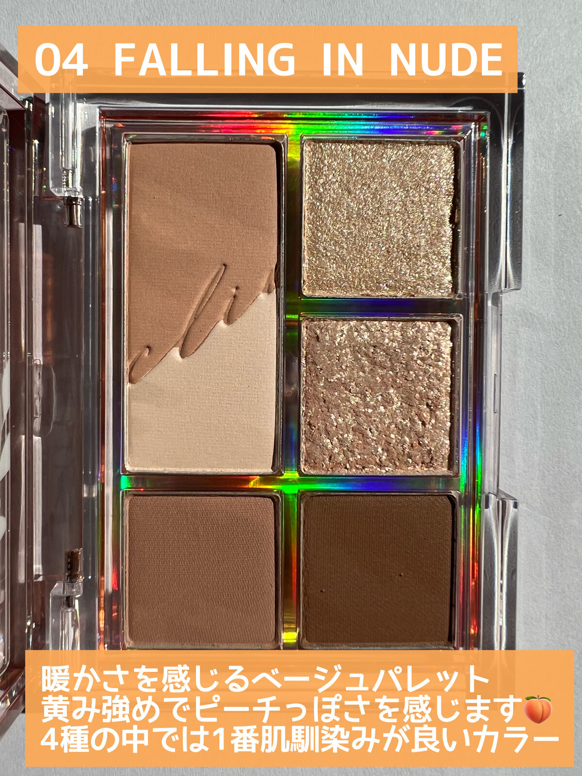 マットとグリッターで構成された6色パレット どれもナチュラルな発色でデイリーメイクに🙆🏻♀️ 持ち運びしやすいコンパクトサイズです✨ 黄みが強くないブラウン系パレット 全体的に濃すぎないのでナチュラルに使いやすい👏🏻 オフィスメイクにも🙆🏻♀️ モーヴミュートピンク系パレット 落ち着いたトーンのローズピンクがメイン🌹 腫れぼったく見えず、使いやすい色味です✨ 柔らかい色味のモーヴパープル系パレット ニュアンスな発色で肌馴染みの良いカラー🙌🏻 温かさを感じる黄み強めのベージュ系パレット 少しピーチっぽさも感じる色味です🍑