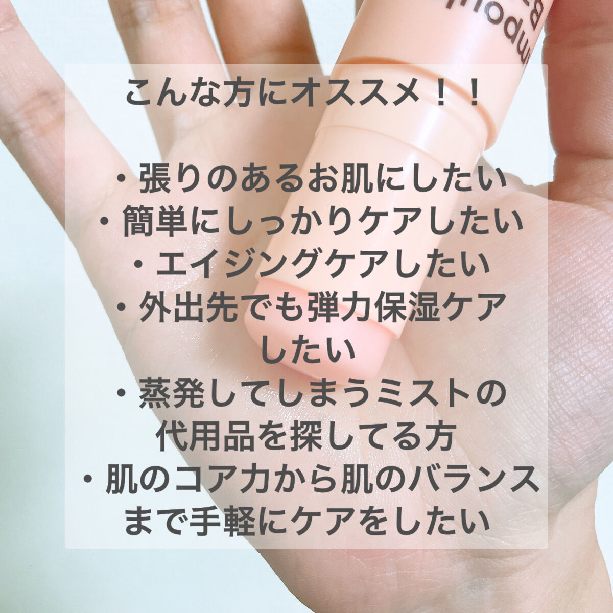 手を汚さずにいつでもどこでも塗れます💯✨ 外出先で乾燥が気になったときにササッと使えるのも嬉しいです💛 塗ってみると、ベタつきがあまりなくて、バームでありながらもがっつり塗ってる感がないのが個人的に良かったです⭕️ このアンプルバームは水溶性のコラーゲンが配合されていて、一般的なコラーゲンより保水性が高いこと、そしてペプチドによってキメを整えてハリのある肌にしてくれます💡
