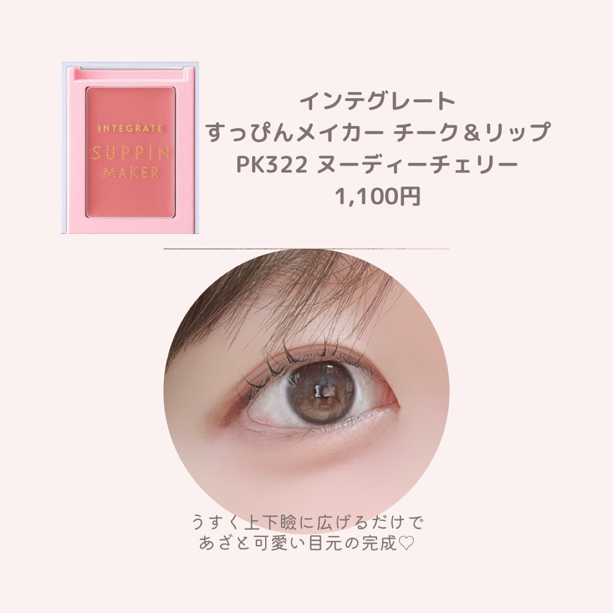 手持ちのクリームチーク比較ちふれリップ&チークバーム落ち着いたいい色♡インテグレートすっぴんメイカーチーク&リップPK322ヌーディーチェリーポップなピンク💖#PR#ちふれ#春支度コスメ紹介動画...