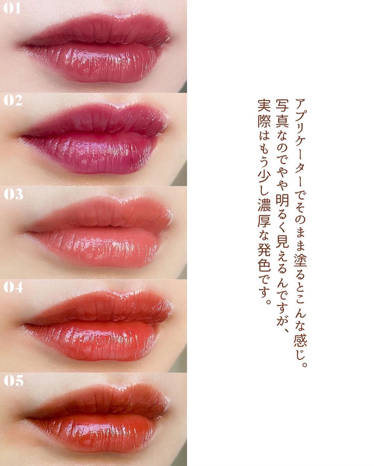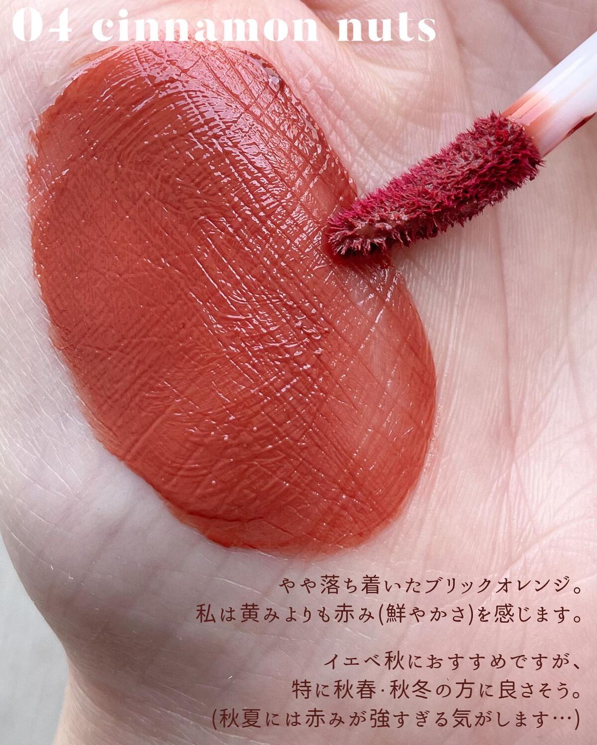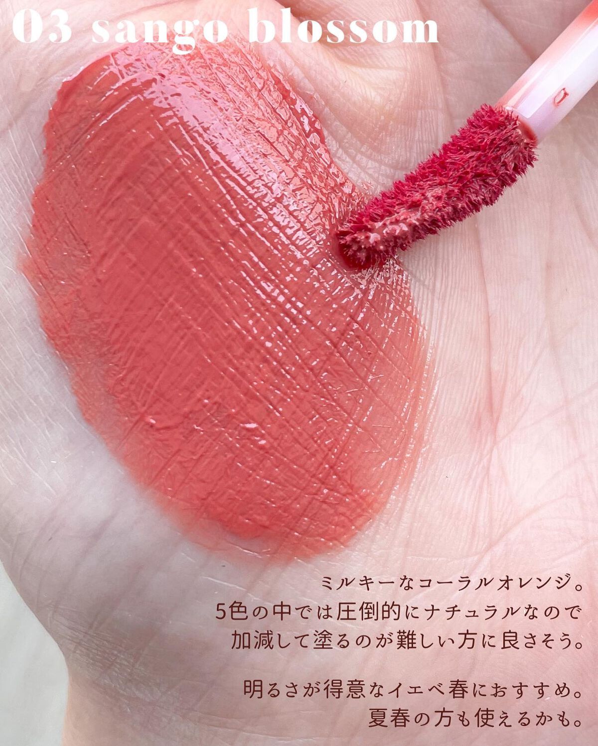水みたいに軽いツヤツヤな仕上がり。 ベタベタしないし、付けてる感が少ないので快適ですよ✨ 全体的にイエベに寄った色展開です。 もしブルベさんが使うなら03が一番馴染むかな? ウォームスプリングの私は圧倒的に04がお気に入りです〜!! 黄みたっっっぷり🍊 一度ティッシュオフをするとマスクにも付きづらいので是非試してみてください🥰