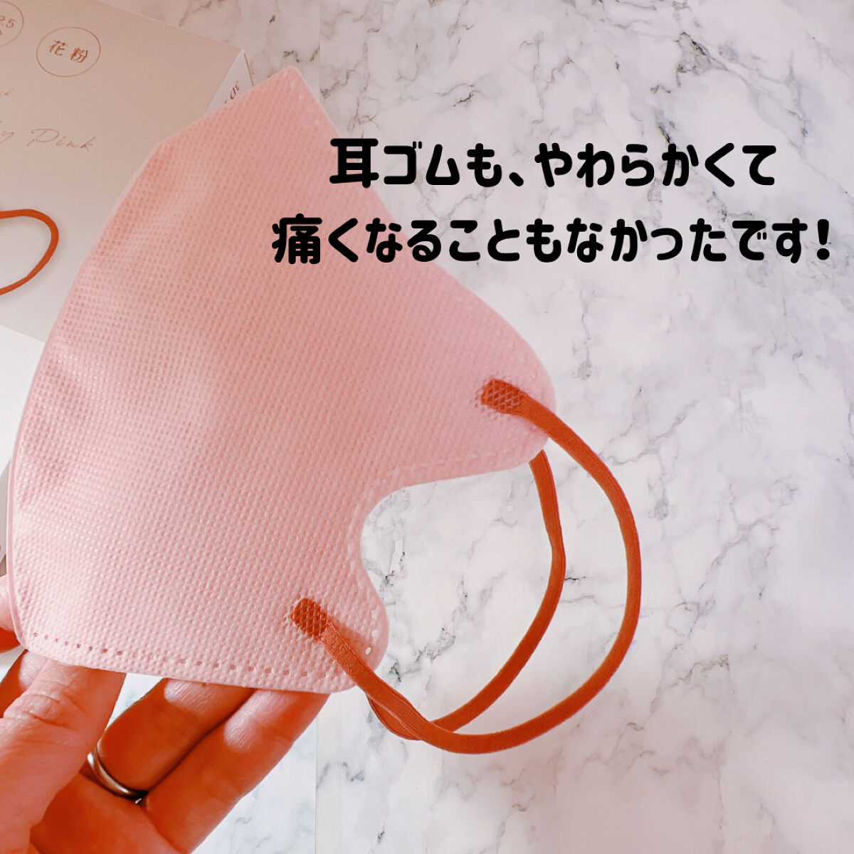 呼吸しやすく、長時間つけていても快適に過ごすことができます。 メイクや口紅などがつきにくく、お肌にも優しい! 耳の紐の部分も太めになっているので長時間つけていても耳などが擦れて痛くなりにくいのも助かります。