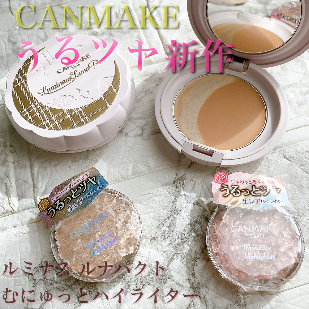 キャンメイクむにゅっとハイライター02ローズクォーツ¥638キャンメイクから出てるハイライトで、すごく柔らかい。ほんとに、むにゅっとしてる。クリームハイライトで名前の通りむにゅっとした質感だけど、塗るとサラサラに。ピンクがかったパールがとても...