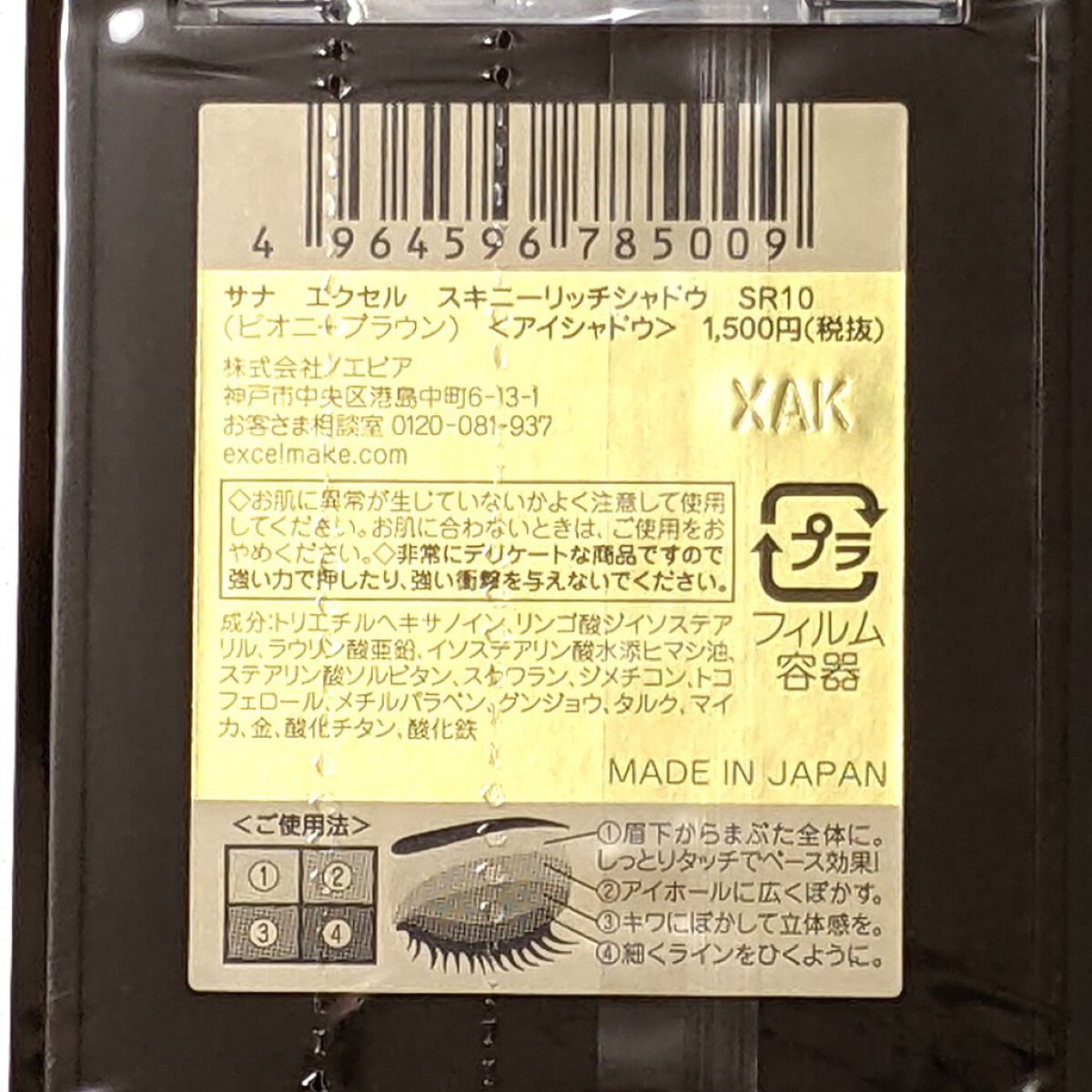 - <SR01 ベージュブラウン> トリエチルヘキサノイン、リンゴ酸ジイソステアリル、ラウリン酸亜鉛、イソステアリン酸水添ヒマシ油、ステアリン酸ソルビタン、スクワラン、ジメチコン、トコフェロール、メチルパラベン、(+/-)タルク、マイカ、金、酸化チタン、酸化鉄、水酸化Al、赤226 <SR02 リアルブラウン> トリエチルヘキサノイン、リンゴ酸ジイソステアリル、ラウリン酸亜鉛、イソステアリン酸水添ヒマシ油、ステアリン酸ソルビタン、スクワラン、ジメチコン、トコフェロール、メチルパラベン、(+/-)タルク、マイカ、金、酸化チタン、酸化鉄、水酸化Al、赤226 <SR03 ロイヤルブラウン> トリエチルヘキサノイン、リンゴ酸ジイソステアリル、ラウリン酸亜鉛、イソステアリン酸水添ヒマシ油、ステアリン酸ソルビタン、スクワラン、ジメチコン、トコフェロール、メチルパラベン、(+/-)タルク、マイカ、金、酸化チタン、酸化鉄、水酸化Al、赤226 <SR04 スモーキーブラウン> トリエチルヘキサノイン、リンゴ酸ジイソステアリル、ラウリン酸亜鉛、イソステアリン酸水添ヒマシ油、ステアリン酸ソルビタン、スクワラン、ジメチコン、トコフェロール、メチルパラベン、(+/-)タルク、マイカ、金、酸化チタン、酸化鉄、水酸化Al、赤226 <SR05 ウォームブラウン> トリエチルヘキサノイン、リンゴ酸ジイソステアリル、ラウリン酸亜鉛、イソステアリン酸水添ヒマシ油、ステアリン酸ソルビタン、スクワラン、ジメチコン、トコフェロール、メチルパラベン、(+/-)タルク、マイカ、金、酸化チタン、酸化鉄、水酸化Al、赤226 <SR06 センシュアルブラウン> トリエチルヘキサノイン、リンゴ酸ジイソステアリル、ラウリン酸亜鉛、イソステアリン酸水添ヒマシ油、ステアリン酸ソルビタン、スクワラン、ジメチコン、トコフェロール、メチルパラベン、(+/-)タルク、マイカ、金、酸化チタン、酸化鉄、水酸化Al、赤226 <SR07 マグノリアブラウン(限定)> トリエチルヘキサノイン、リンゴ酸ジイソステアリル、ラウリン酸亜鉛、イソステアリン酸水添ヒマシ油、ステアリン酸ソルビタン、スクワラン、ジメチコン、トコフェロール、メチルパラベン、(+/-)グンジョウ、コンジョウ、タルク、マイカ、金、酸化チタン、酸化鉄 <SR08 アクアティックブラウン> トリエチルヘキサノイン、リンゴ酸ジイソステアリル、ラウリン酸亜鉛、イソステアリン酸水添ヒマシ油、ステアリン酸ソルビタン、スクワラン、ジメチコン、トコフェロール、メチルパラベン、(+/-)グンジョウ、コンジョウ、タルク、マイカ、金、酸化チタン、酸化鉄 <SR09 ベビーブラウン> トリエチルヘキサノイン、リンゴ酸ジイソステアリル、ラウリン酸亜鉛、イソステアリン酸水添ヒマシ油、ステアリン酸ソルビタン、スクワラン、ジメチコン、トコフェロール、メチルパラベン、タルク、ホウケイ酸(Ca/Al)、マイカ、金、酸化チタン、酸化鉄、赤226 <SR10 ピオニーブラウン> トリエチルヘキサノイン、リンゴ酸ジイソステアリル、ラウリン酸亜鉛、イソステアリン酸水添ヒマシ油、ステアリン酸ソルビタン、スクワラン、ジメチコン、トコフェロール、メチルパラベン、グンジョウ、タルク、マイカ、金、酸化チタン、酸化鉄 <SR11 ブリックブラウン> トリエチルヘキサノイン、リンゴ酸ジイソステアリル、ラウリン酸亜鉛、イソステアリン酸水添ヒマシ油、ステアリン酸ソルビタン、スクワラン、ジメチコン、トコフェロール、メチルパラベン、タルク、マイカ、金、酸化チタン、酸化鉄、赤202、赤226 <SR12 デニッシュブラウン(限定)> トリエチルヘキサノイン、リンゴ酸ジイソステアリル、ラウリン酸亜鉛、イソステアリン酸水添ヒマシ油、ステアリン酸ソルビタン、スクワラン、ジメチコン、シリカ、トコフェロール、ホウケイ酸(Ca/Al)、酸化スズ、メチルパラベン、グンジョウ、タルク、マイカ、金、酸化チタン、酸化鉄、赤226 <SR01'23 ベージュブラウン(限定デザイン)> トリエチルヘキサノイン、リンゴ酸ジイソステアリル、ラウリン酸亜鉛、イソステアリン酸水添ヒマシ油、ステアリン酸ソルビタン、スクワラン、ジメチコン、トコフェロール、メチルパラベン、(+/-)タルク、マイカ、金、酸化チタン、酸化鉄、水酸化Al、赤226 <SR03'23 ロイヤルブラウン(限定デザイン)> トリエチルヘキサノイン、リンゴ酸ジイソステアリル、ラウリン酸亜鉛、イソステアリン酸水添ヒマシ油、ステアリン酸ソルビタン、スクワラン、ジメチコン、トコフェロール、メチルパラベン、(+/-)タルク、マイカ、金、酸化チタン、酸化鉄、水酸化Al、赤226 <SR11'23 ブリックブラウン(限定デザイン)> トリエチルヘキサノイン、リンゴ酸ジイソステアリル、ラウリン酸亜鉛、イソステアリン酸水添ヒマシ油、ステアリン酸ソルビタン、スクワラン、ジメチコン、トコフェロール、メチルパラベン、(+/-)タルク、マイカ、金、酸化チタン、酸化鉄、水酸化Al、赤226 <SR13 ヘーゼルブラウン(限定)> トリエチルヘキサノイン、リンゴ酸ジイソス
