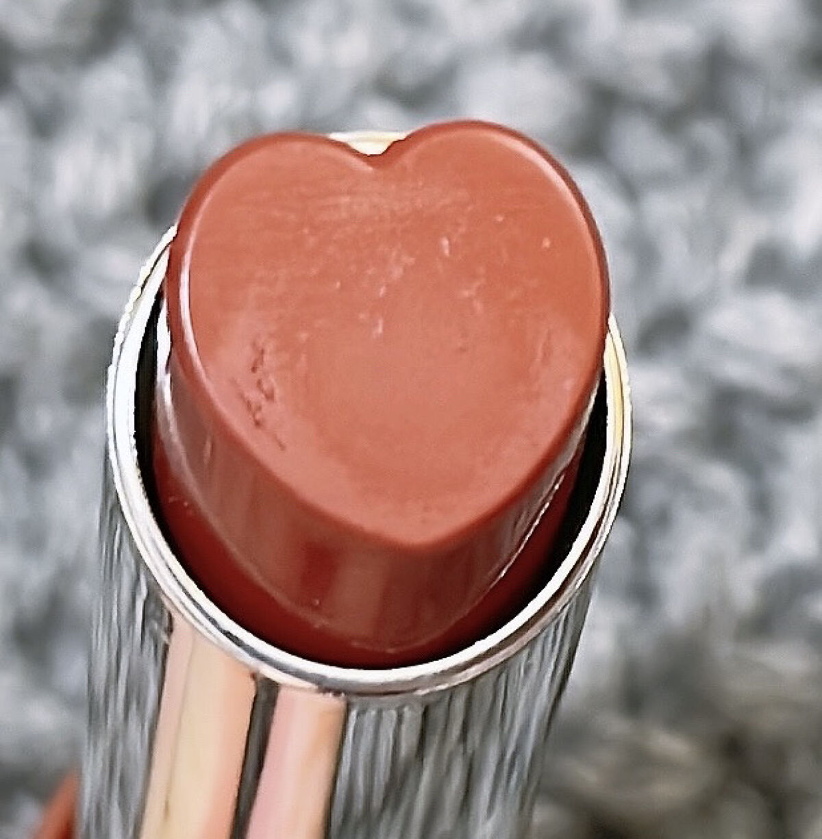 本当にガナッシュみたいなチョコレート色で秋っぽい色味です 発色は問題なしだし、ハート型もかわいいと思うけど、やはり縦じわが目立ってしまう 下にしっとりめのリップクリームを仕込んでから塗ると、いいかも。