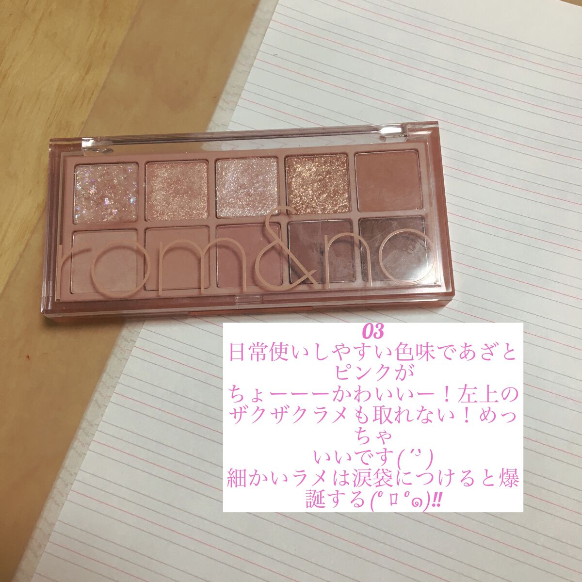 03ピンクいっぱいでイエベブルベ関係なく使えます! 04クールトーンのグレーパレットでブルベさん大優勝🐶🥇 04はオールマットです! 03は細かいラメが可愛すぎる 最高ですザクザクラメもしっかり密着します💕 こちらも最高です💕ただ04の赤みがかったグレーのところが思ったよりちょっと薄かったかな?くらいです 全て…!発色もカラーも最高です…💕 今は特に思い当たりません!使えば使うほど他の色まで欲しくなってきちゃいます…🤦🏻♀️