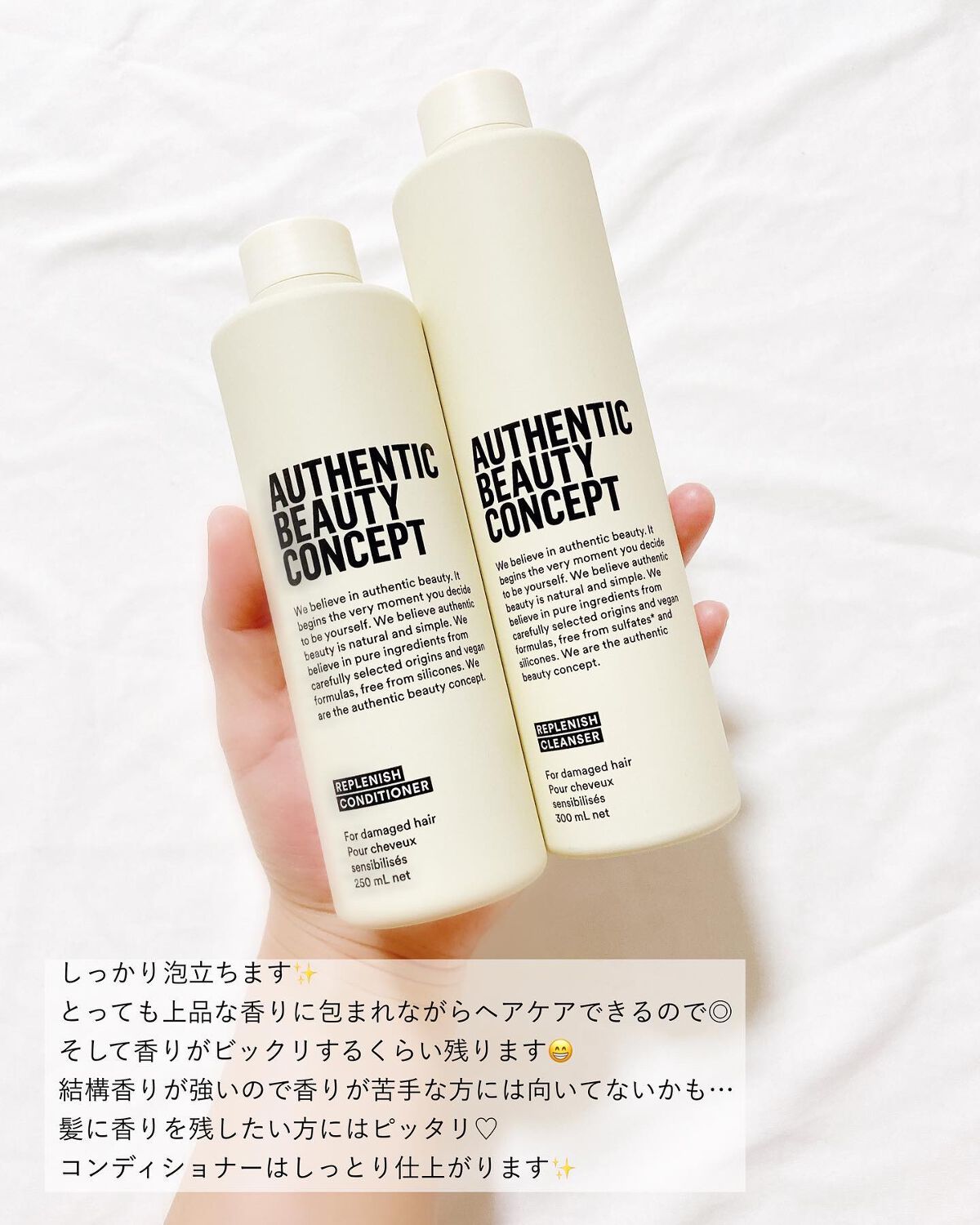 Authentic Beauty Conceptはサステナブルビューティケアブランド。 こちらのリプレニッシュはダメージを受けたデリケートな髪を補修。 栄養満点なヴィーガンフード「メープルシロップ」と「ピーカンナッツ」のエキス(補修成分)を配合。 プルメリア・ジャスミン・ピーカンナッツの香り。 一言で言うならば最近あまり見かけないけど日焼けオイルみたいな香り。 外人さんから香ってきそうな濃厚な甘さ。 シャンプーでは珍しい香り。 シャンプーは少量でもしっかり泡立ち、コンディショナーは緩すぎず髪に馴染ませやすい。 仕上がりはしっとりサラサラで纏まりが良くいつもよりツヤを感じられました! 硫酸系界面活性剤、パラベン、シリコーン、鉱物油、人工色素を含んでないのも嬉しい◎