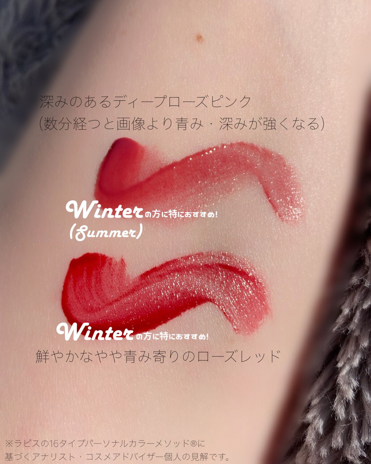 - <14 デイリー> 精製水、ダイアイソステアリルマレート、ビス-ジグリセリルポリアシルアジペート-2、ハイドロゼネテッドポリイソブテン、ポリグリセリル-2アイソステアレート/ダイマーダイリノリエートコポリマー、グリセリン、フィトステリル/イソステアリル/セチル/ステアリル/ベヘニルダイマージリノリエート、オクチルドデカノール、ポリソルベート60、チタンジオキシド、ポリアクリルアミド、香料、1,2-ヘキサンジオール、C13-14 イソアルケイン、カプリリルグリコール、ブチレングリコール、ラウレス-7、黄色5号、エチルヘキシルグリセリン、スターアニスエキス、赤色227号、青色1号 <15 スプリング> 精製水、ダイアイソステアリルマレート、ビス-ジグリセリルポリアシルアジペート-2、ハイドロゼネテッドポリイソブテン、ポリグリセリル-2アイソステアレート/ダイマーダイリノリエートコポリマー、グリセリン、フィトステリル/イソステアリル/セチル/ステアリル/ベヘニルダイマージリノリエート、オクチルドデカノール、ポリソルベート60、チタンジオキシド、ポリアクリルアミド、香料、1,2-ヘキサンジオール、C13-14 イソアルケイン、カプリリルグリコール、ブチレングリコール、黄色5号、Laureth-7、エチルヘキシルグリセリン、スターアニスエキス、赤色227号、青色1号 < 16 サマー> 精製水、ダイアイソステアリルマレート、ビス-ジグリセリルポリアシルアジペート-2、ハイドロゼネテッドポリイソブテン、ポリグリセリル-2アイソステアレート/ダイマーダイリノリエートコポリマー、グリセリン、フィトステリル/イソステアリル/セチル/ステアリル/ベヘニルダイマージリノリエート、オクチルドデカノール、ポリソルベート60、チタンジオキシド、ポリアクリルアミド、香料、1,2-ヘキサンジオール、C13-14 イソアルケイン、カプリリルグリコール、ブチレングリコール、ラウレス-7、黄色5号、エチルヘキシルグリセリン、赤色227号、スターアニスエキス、青色1号 <17 オータム> 精製水、ダイアイソステアリルマレート、ビス-ジグリセリルポリアシルアジペート-2、ハイドロゼネテッドポリイソブテン、ポリグリセリル-2アイソステアレート/ダイマーダイリノリエートコポリマー、グリセリン、フィトステリル/イソステアリル/セチル/ステアリル/ベヘニルダイマージリノリエート、オクチルドデカノール、ポリソルベート60、チタンジオキシド、ポリアクリルアミド、香料、C13-14 イソアルケイン、1,2-ヘキサンジオール、カプリリルグリコール、ブチレングリコール、黄色5号、ラウレス-7、赤色227号、エチルヘキシルグリセリン、スターアニスエキス、青色1号 <18 ウィンター> 精製水、ダイアイソステアリルマレート、ビス-ジグリセリルポリアシルアジペート-2、ハイドロゼネテッドポリイソブテン、ポリグリセリル-2アイソステアレート/ダイマーダイリノリエートコポリマー、グリセリン、フィトステリル/イソステアリル/セチル/ステアリル/ベヘニルダイマージリノリエート、オクチルドデカノール、ポリソルベート60、チタンジオキシド、ポリアクリルアミド、C13-14 イソアルケイン、香料、1,2-ヘキサンジオール、カプリリルグリコール、ブチレングリコール、赤色227号、ラウレス-7、黄色5号、エチルヘキシルグリセリン、スターアニスエキス、青色1号