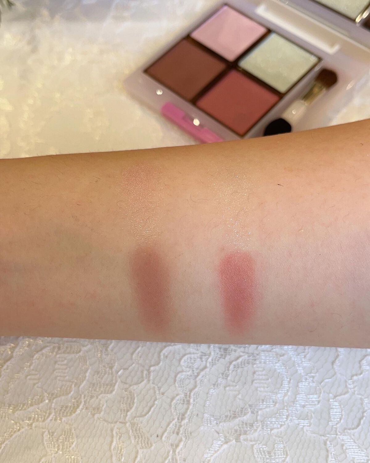 真ん中の桜ピンクをベースに下の2色でグラデを作るんだけど、左上の煌めきの強いホワイト系のカラーをグラデーションをぼかすように重ねると目元に透明感が出てめっちゃ春らしくなるの🪻 BAさんに色々使い方を聞いたんだけど、右上のカラーは目頭くの字に入れたり、まぶた中央に重ねてハイライト的に使うのがおすすめらしいです✨ しめ色もパープルがかったブラウンだからこのパレットは特にブルベさん大歓喜だと思う🩵 唇全体に塗るというよりは、中央の山の部分を縁取るように塗る方法をBAさんがやってたから私も実践してやってます😀 新年からめっちゃ優しいBAさんに出会えてコスメについて熱く語れたし、高かったけどいいコスメに出会えてまたさらにコスメ熱が上がった気がする❤️🔥
