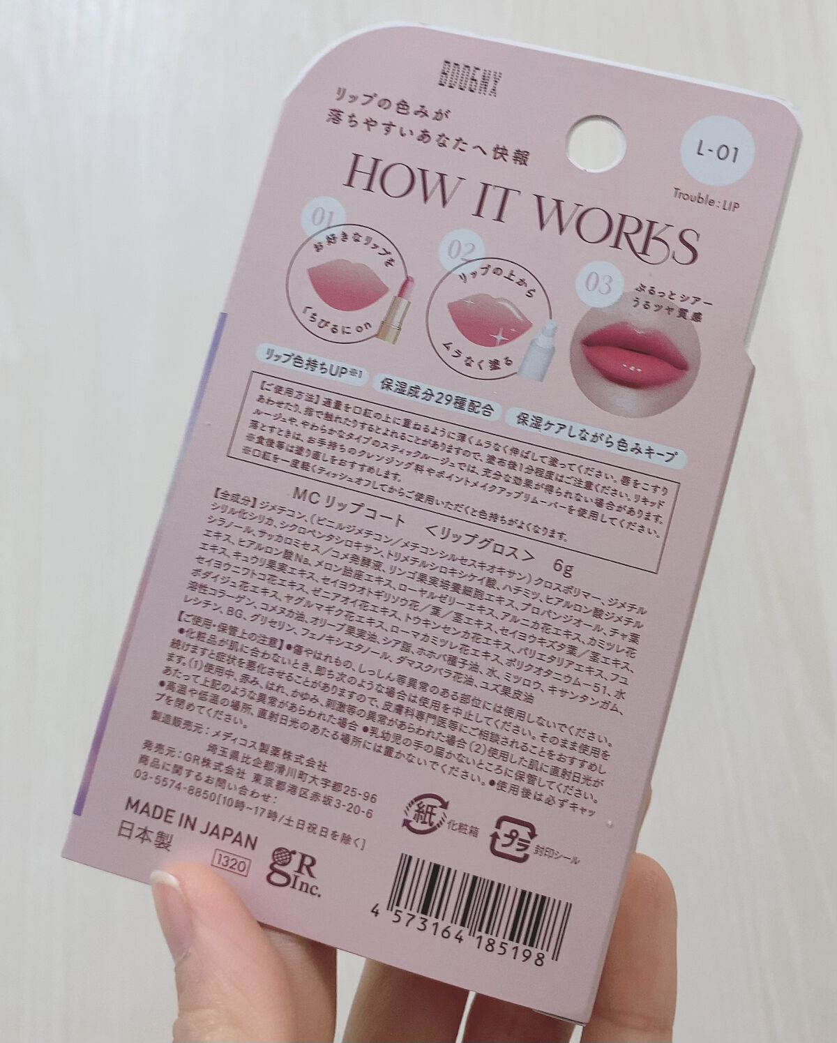 - リップの色持ちをキープするジェル状リップコート。手持ちのリップの上から塗るだけで落ちにくく色移りしにくい、うるおい・ツヤ続く。 保湿成分29種配合(ヒアルロン酸、ハチミツ、コラーゲン、ローヤルゼリー、植物幹細胞エキス、シアバター、プロポリス、オリーブ、ホホバ、チャ葉エキス、コメ発酵液など)。透明ジェルタイプ/無香料。