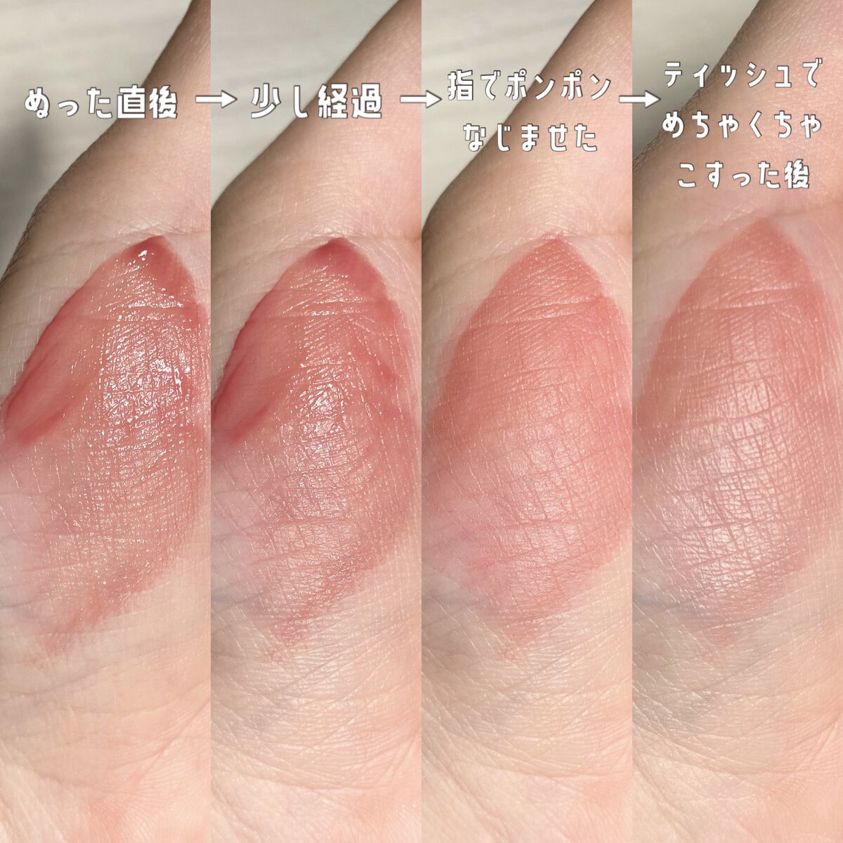 唇に乗せた時は気にならなかったですが 手にスウォッチしたときに繊維っぽいものが 入っていました。チップの毛かなと思います 色味、ティント効果とってもタイプで100点満点 なのですが、繊維が気になったので ★★★★☆星をひとつ減らさせていただきました