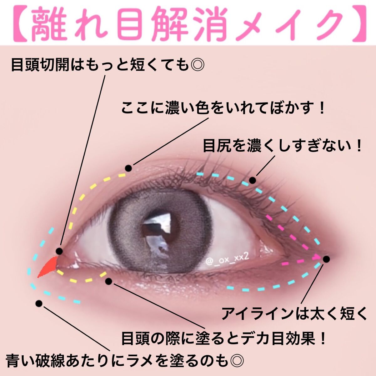 💗ベースカラーを全体にのせる💗 薄めのカラーがオススメです! 🍊二重幅にグラデーションになるようにのせる🍊 目の縦幅を出すためにグラデにします! 🍇アイライナーを長めに引く🍇 上目頭と上目尻に引く、目の横幅を出すためです!