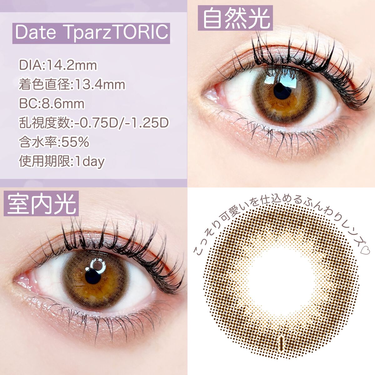 TOPARDSデートトパーズナチュラルに盛れるカラコン探したところ同年代の皆様の口コミに惹かれて購入🤍ブラウンカラーで、ふんわり優しい印象を与えてくれるカラコン🤍ナチュラルでちゅるん系を自然に演出してくれました🤍光の入り方で見え方も少し変わる...