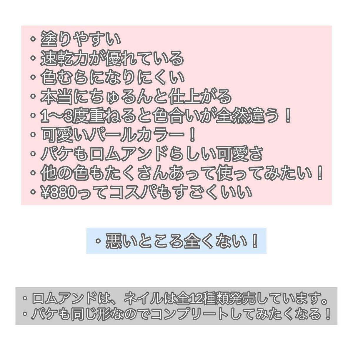 - 指先に玉石のような、ならかな光沢をとどめる。塗った瞬間から綺麗なツヤと光沢を維持し、重ねて塗っても透き通ったカラー感を鮮やかにとどめる、素早い乾燥力のナチュラルカラーネイル。「ロムアンド」の次世代型ネイルです。