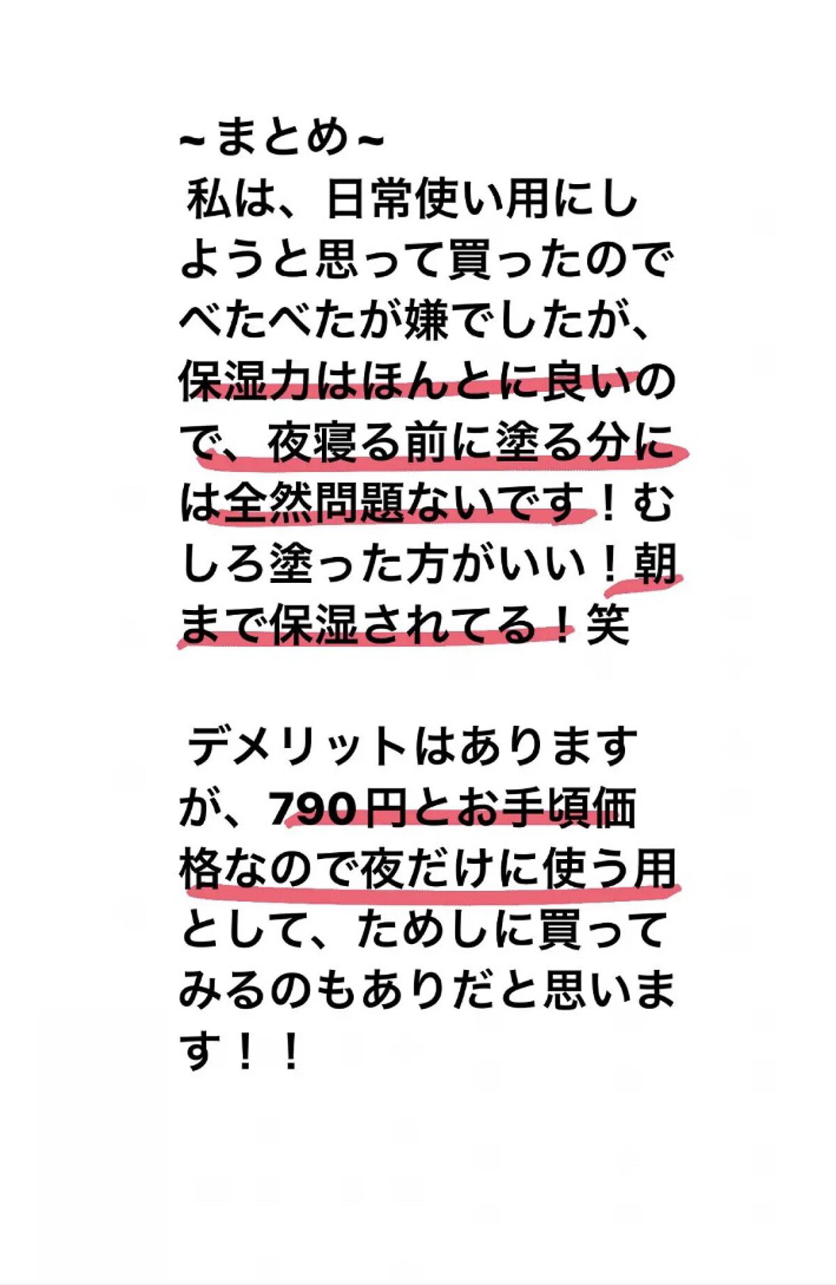 とにかく保湿力が神!! 長時間保湿力が続く 無香料で刺激も少なく誰でも使いやすい 縦じわが消える 少量でも超絶べたべたになります。笑 びっくりするぐらいべたべたしてます、髪の毛とかが唇にひっついちゃいます。笑 気軽に塗るには重すぎて向いないかも 私は、日常使い用にしようと思って買ったのでべたべたが嫌でしたが、保湿力はほんとに良いので、夜寝る前に塗る分には全然問題ないです!むしろ塗った方がいい!朝まで保湿されてる!笑 日常使い出来る保湿リップをお探しの方はニベアなど重くない他の保湿リップを買うのがいいかな〜と思います! ですが、790円とお手頃価格ですし、保湿力はとてもいいので、夜だけに使う用としてためしに買ってみるのはありだと思います!!