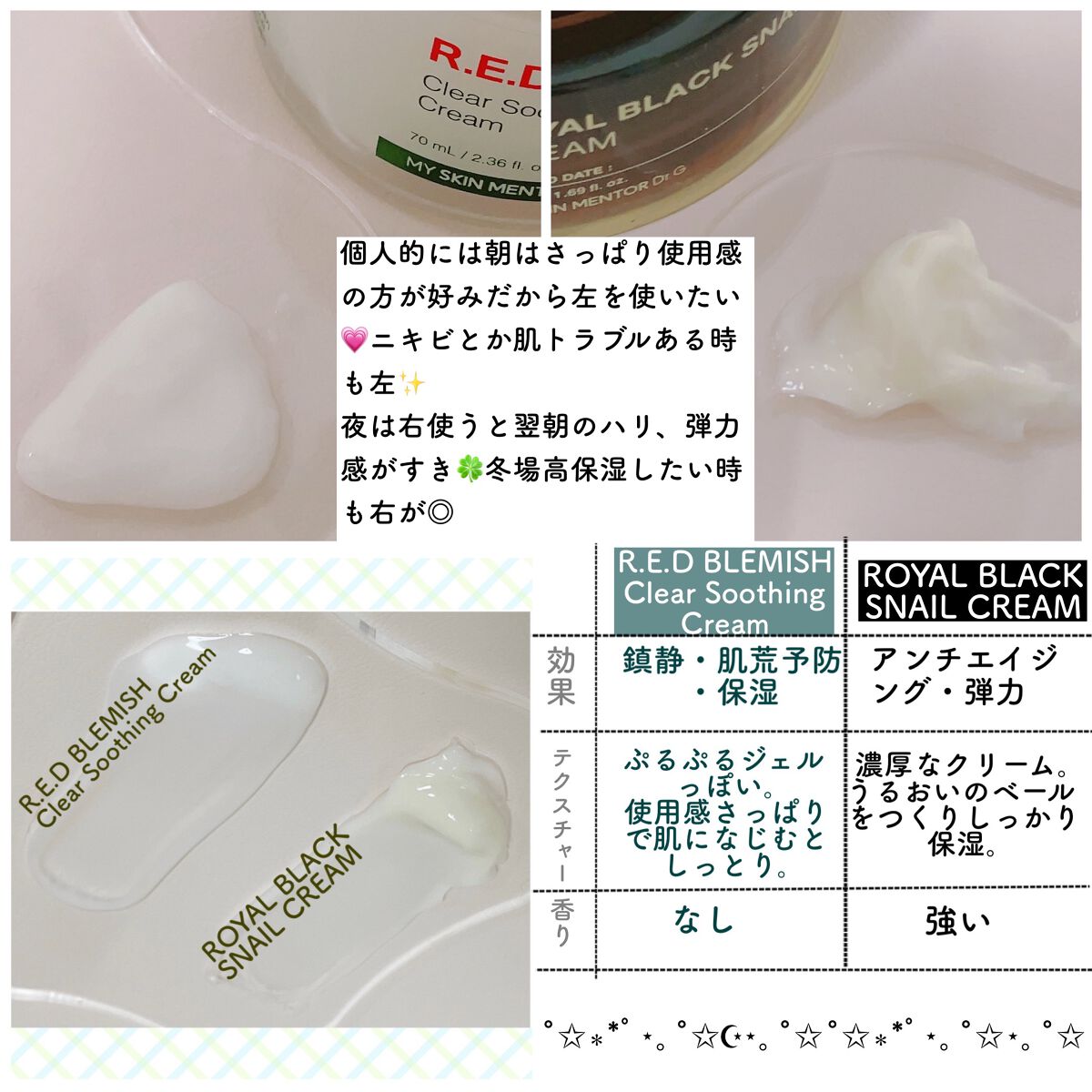レッドブレミッシュ クリア スージングクリーム みずみずしい水分クリームで、さっぱりした使用感! ロイヤルブラックスネイルクリーム こっくり濃厚クリームで、上品な香り。潤いを閉じ込めてくれてハリツヤを与えてくれる印象です。